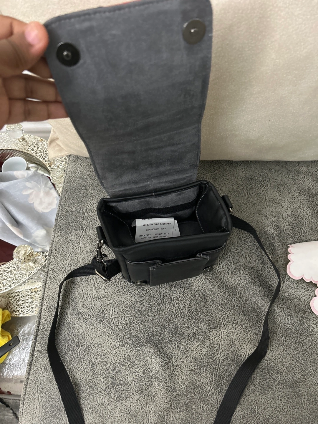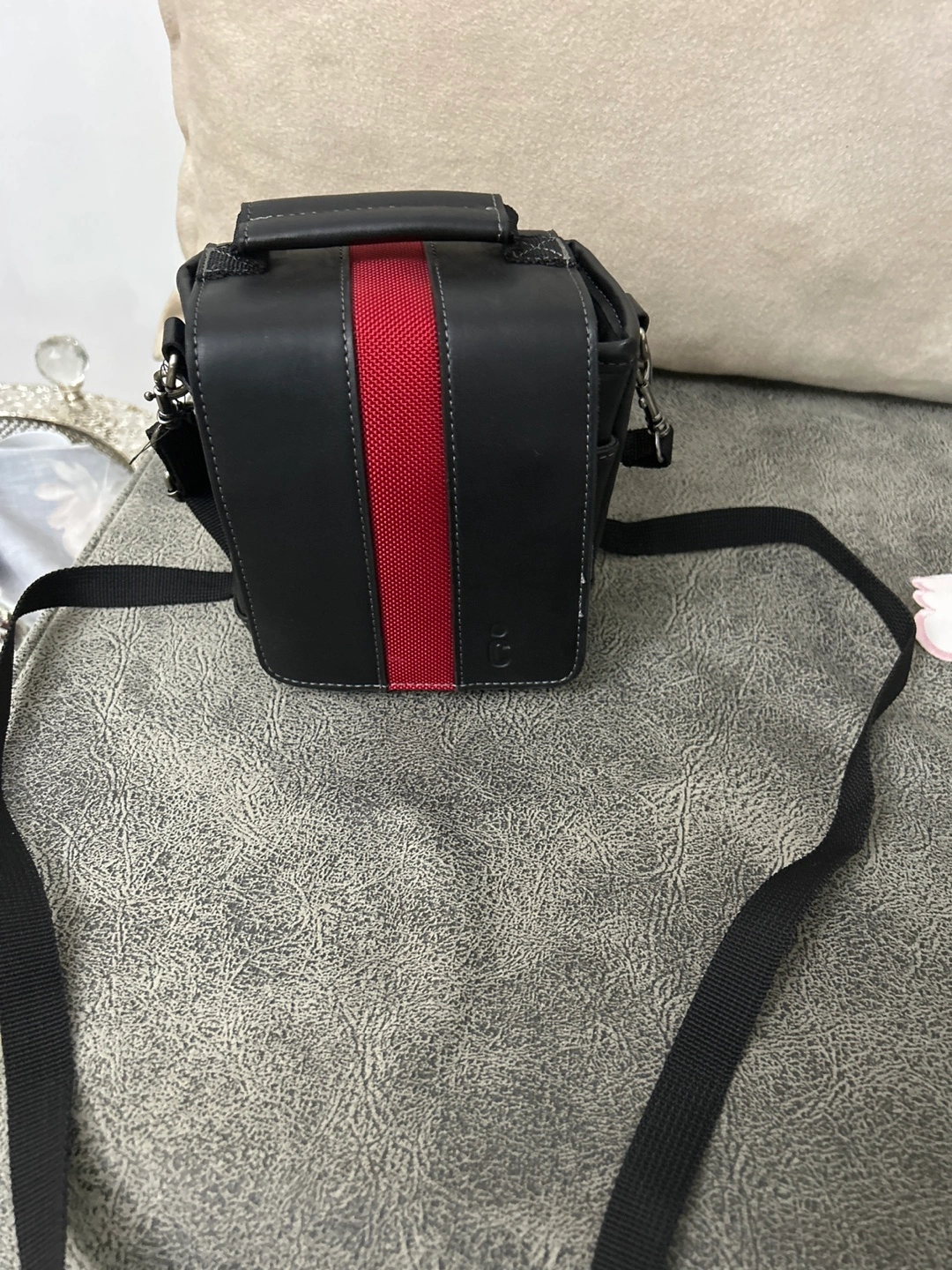 This is a stylish black leather crossbody bag! It's perfect for carrying your essentials while keeping your hands free. The bag features a sleek design with a red stripe and a secure closure. It's in great condition and ready for a new home