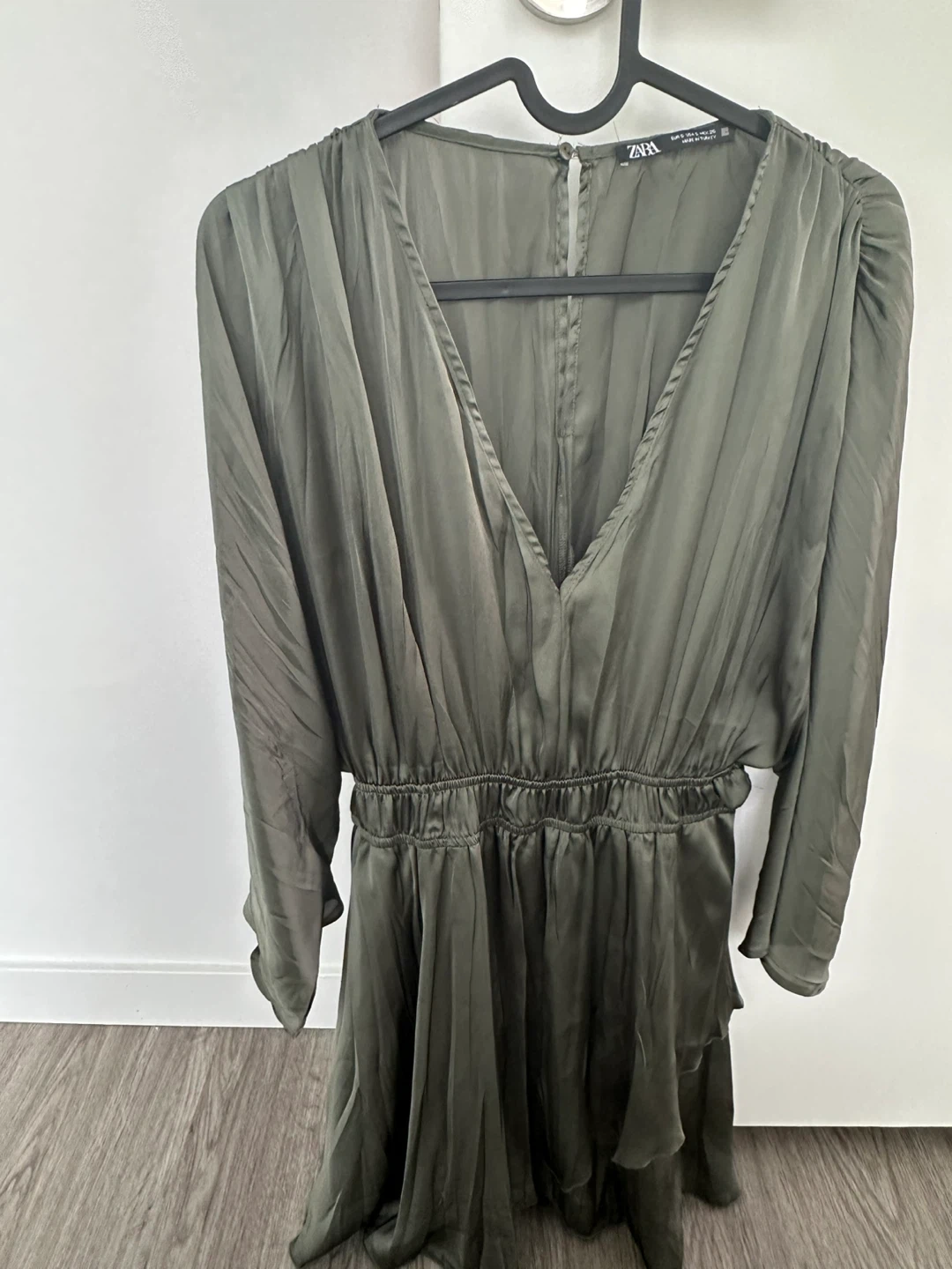 Selling a Zara dress in a beautiful olive green colour! It's a size small and made in Turkey. The dress features a flattering V-neck and a comfortable, flowy design. Perfect for a night out or a special occasion