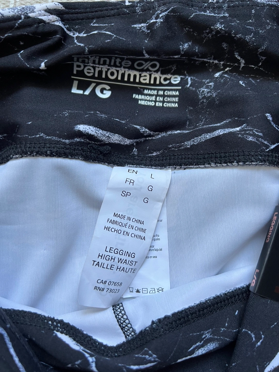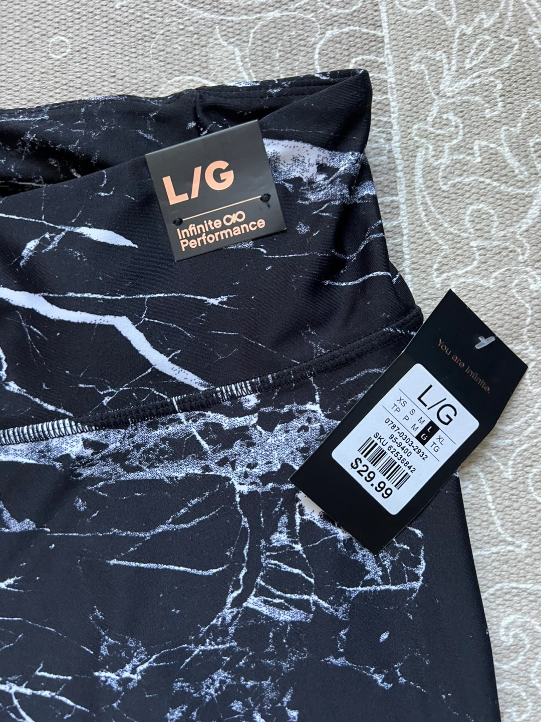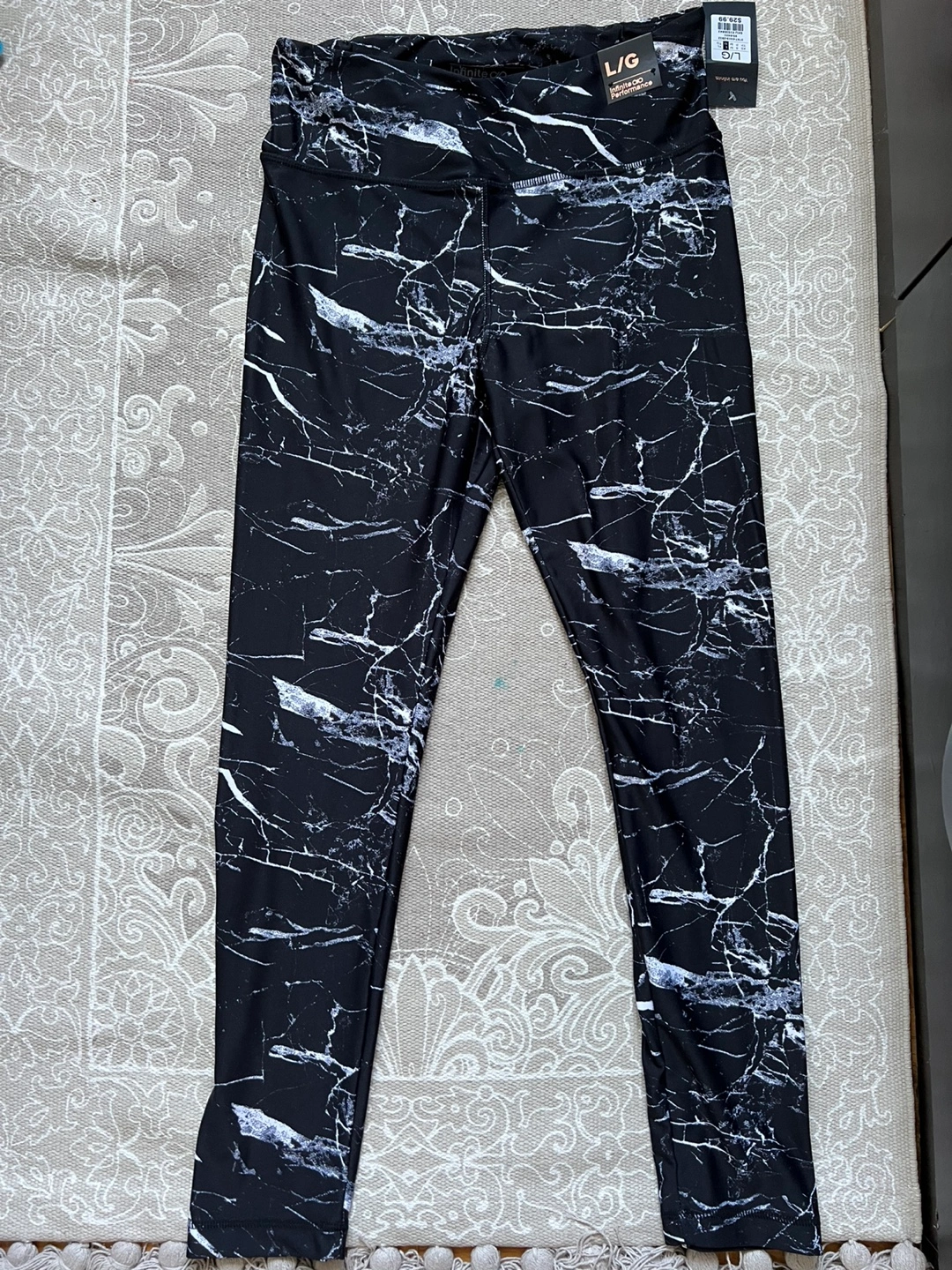 Check out these stylish Infinite Performance leggings! They're a size large and feature a cool marble pattern. The tag shows they were originally $29.99. They're high waisted for a comfy fit!