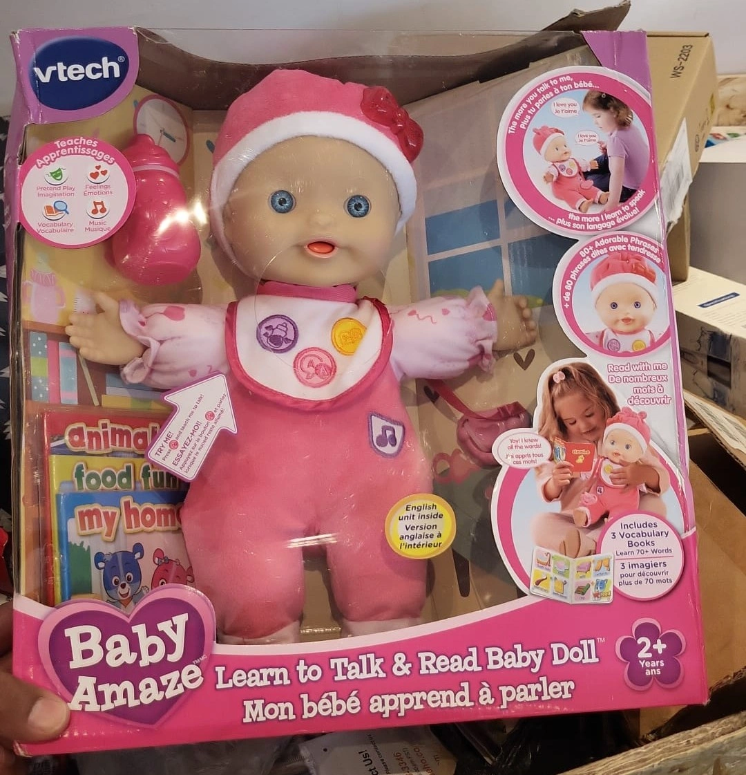 This adorable VTech Baby Amaze Learn to Talk & Read Baby Doll is perfect for little ones aged 2 years and up! It comes with 3 vocabulary books to help your child learn and grow. The doll is brand new and includes its original box!