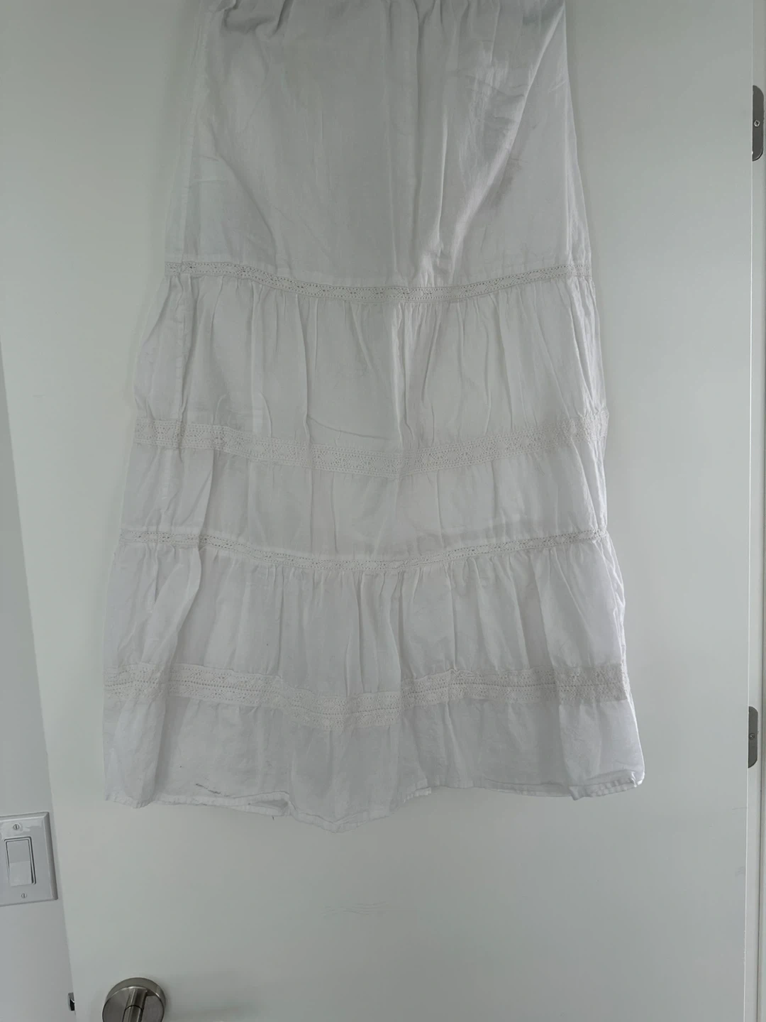 Selling a lovely white tiered skirt from Springfield. It's a size medium and made of a lightweight material, perfect for summer days! The skirt features delicate lace detailing on each tier, adding a touch of elegance.