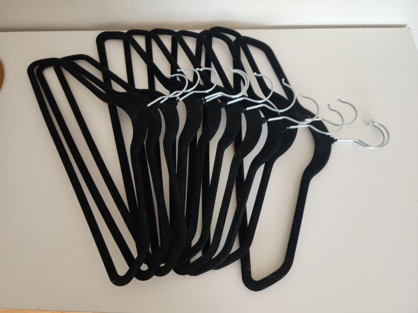 Selling a set of 12 black velvet clothes hangers! They're great for keeping your clothes from slipping and saving space in your closet. They are in great condition