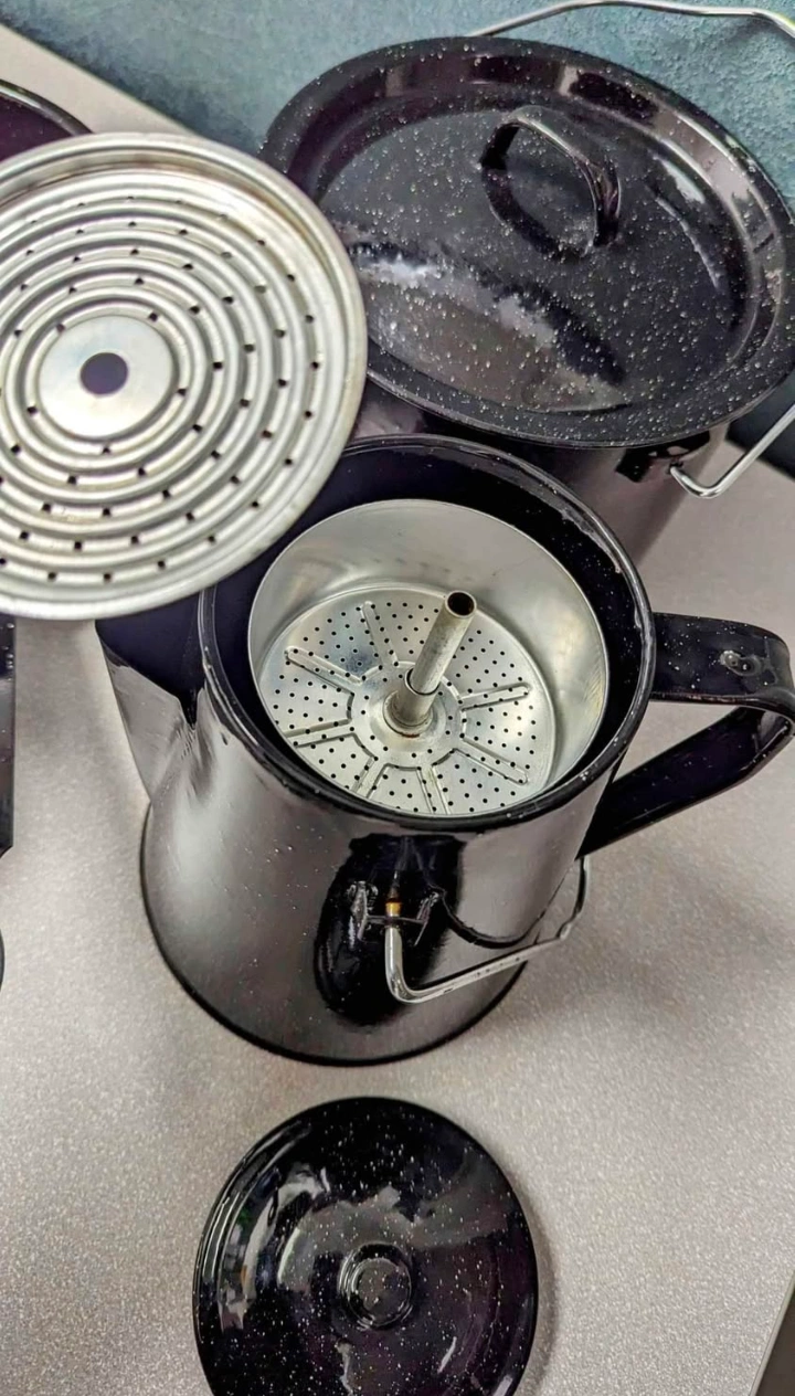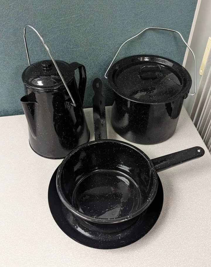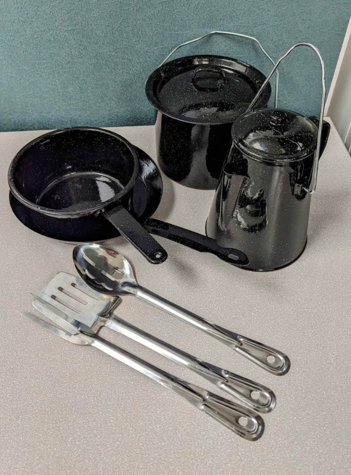 Enamel Camping Cookware Set - Pot Pan Kettle and Utensils