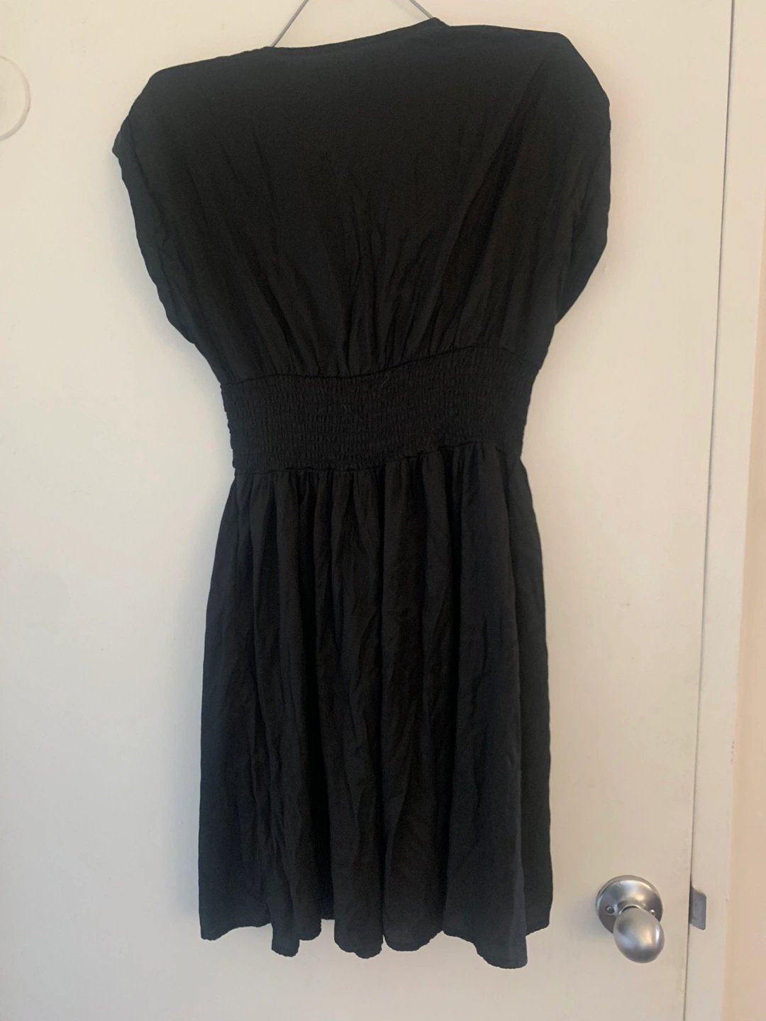 Here's a cute black dress from C’est Moi! It's a size small and would be a great addition to your wardrobe. The dress features a V-neck, a zipper front and pockets! Perfect for late summer/early fall! Smoke free home.