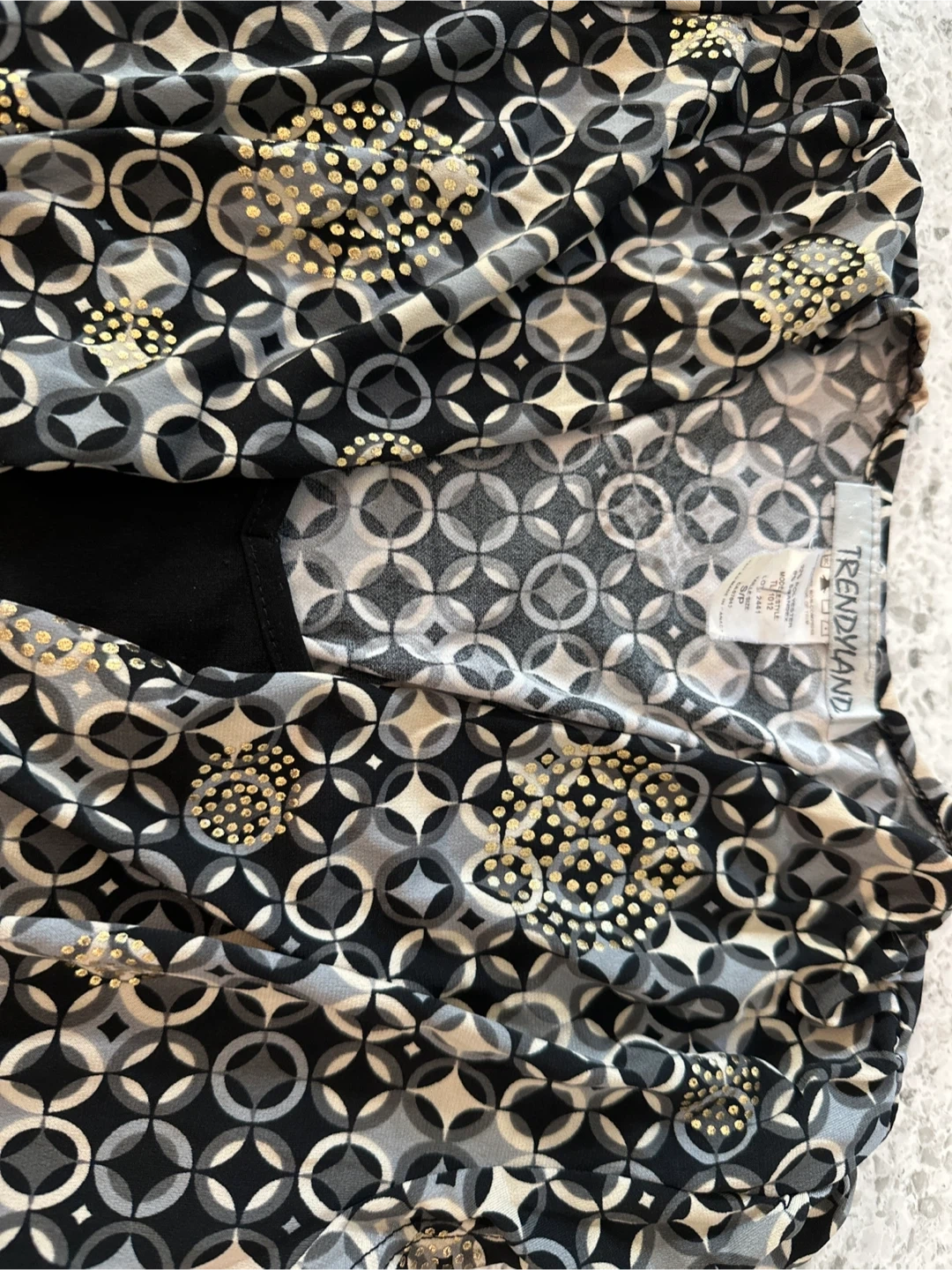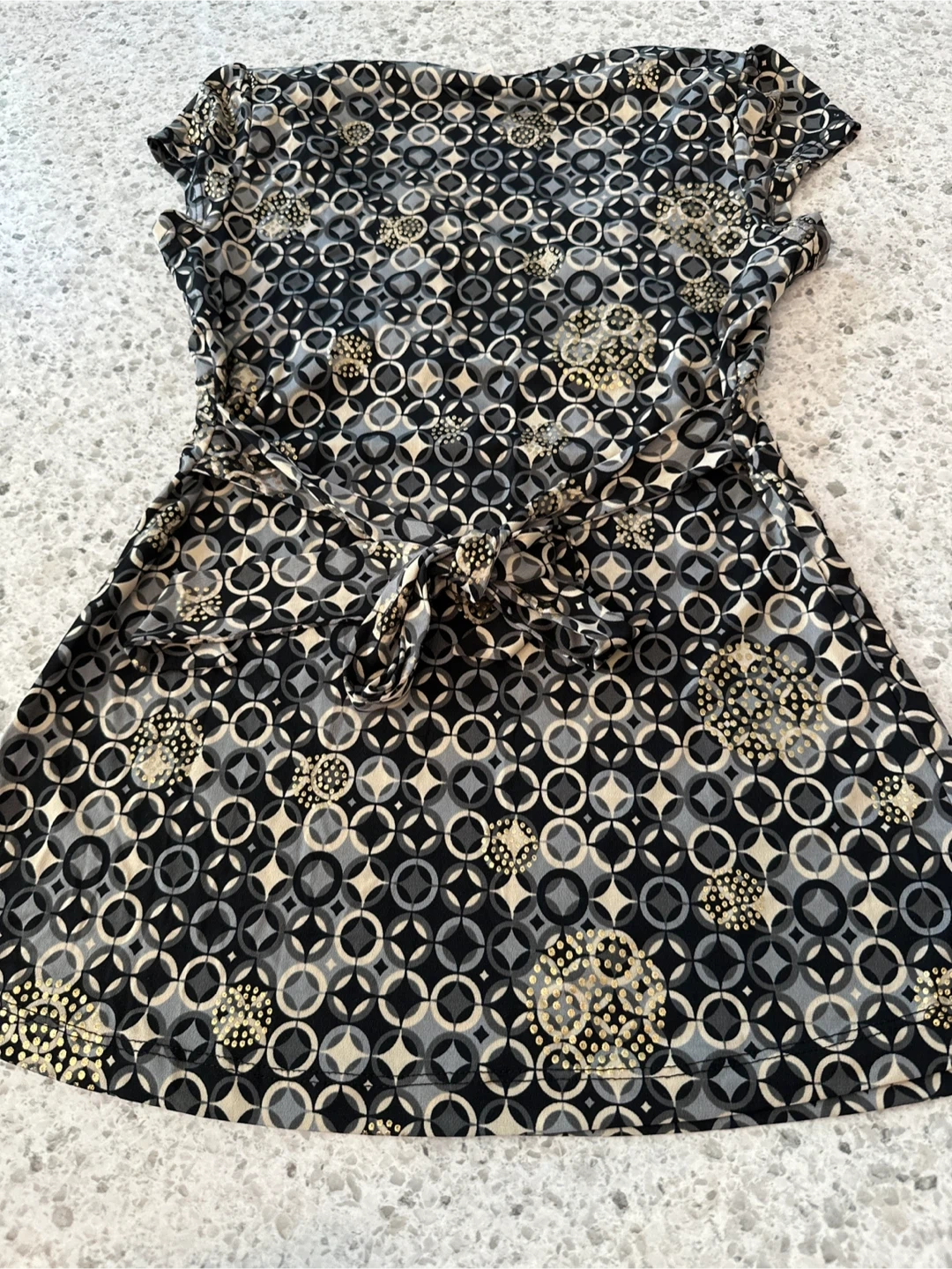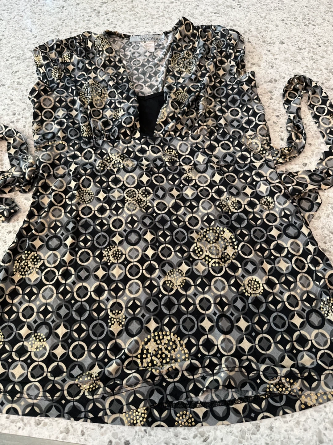 132Women’s Blouse with a unique geometric pattern in black, grey, and gold. Size M. Perfect for a evening out, casual or semi-formal occasion