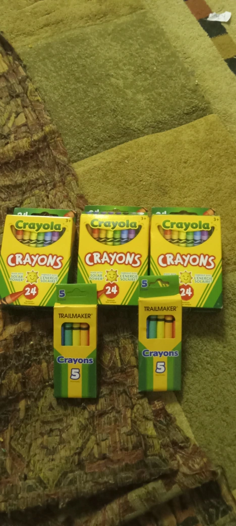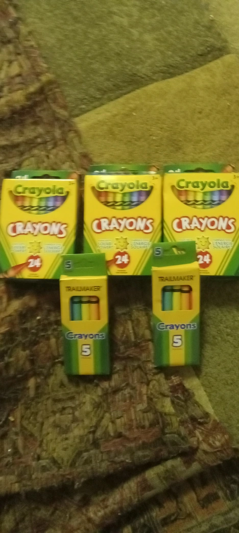 Selling a bundle of crayons! You'll get three boxes of Crayola crayons (24 count) and two boxes of Trailmaker crayons (5 count)!