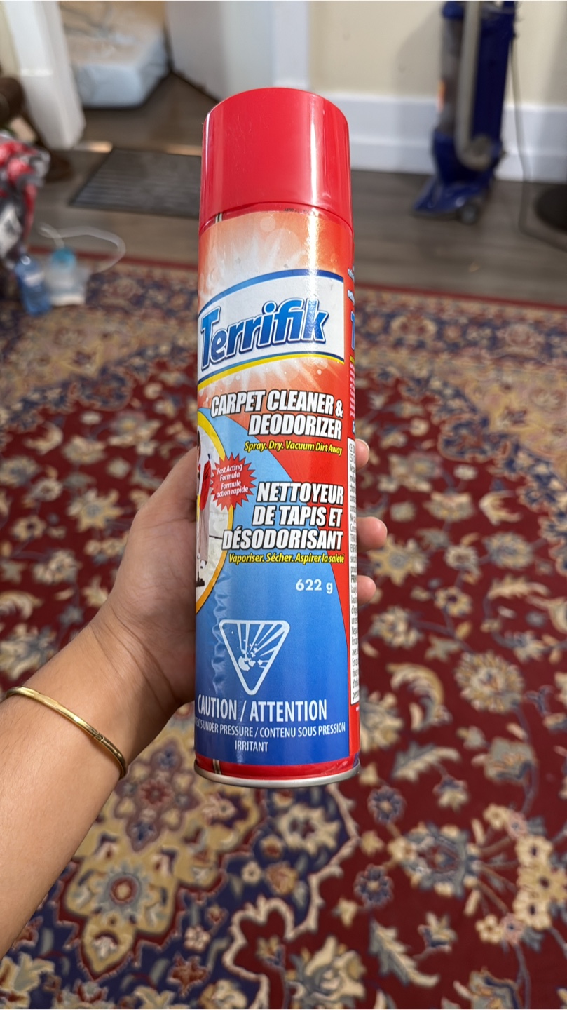 I'm selling a can of Terrifik Carpet Cleaner & Deodorizer. It's a spray, dry, vacuum dirt away formula, and also acts as a deodorizer. The can contains 622g of product. It's also a fast acting formula!