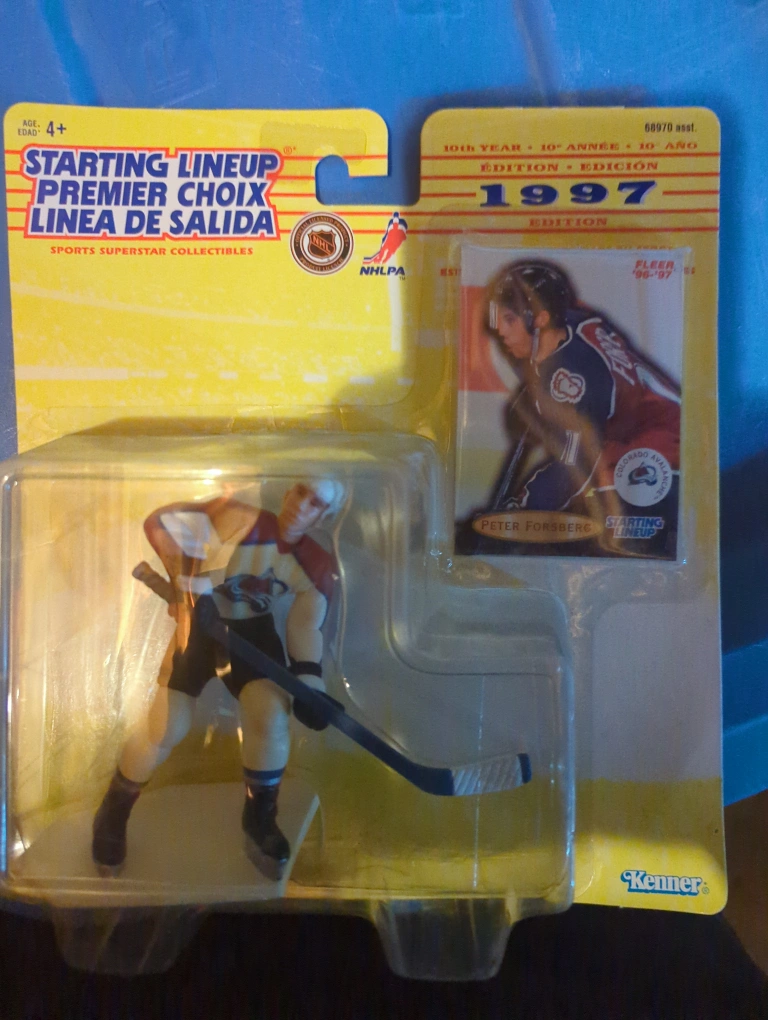 Selling a vintage 1997 Starting Lineup Peter Forsberg action figure. This collectible is still in its original packaging and is suitable for ages 4 and up. A great addition for any hockey fan or collector!