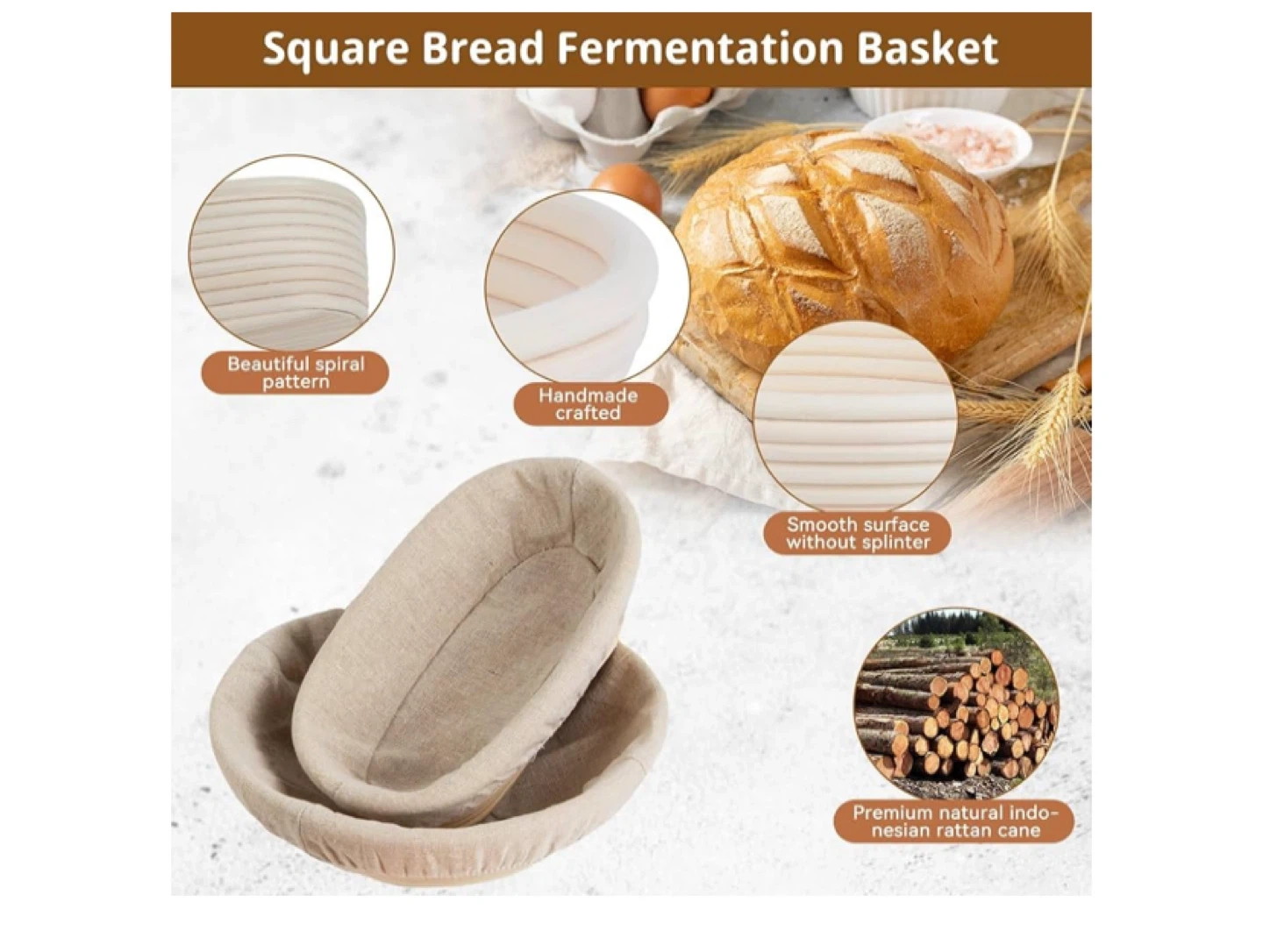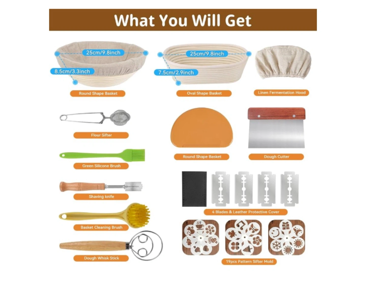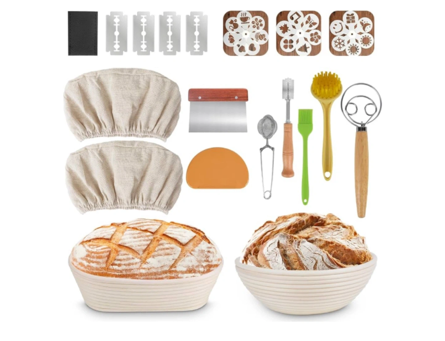 33I'm selling a brand new bread baking proofing basket set. It includes round and oval shape baskets, a linen fermentation hood, flour sifter, green silicone brush, shaving knife, basket cleaning brush, dough whisk stick, dough cutter, 4 blades and leather protective cover, and 19pcs pattern sifter mold. Perfect for making beautiful and delicious bread at home!