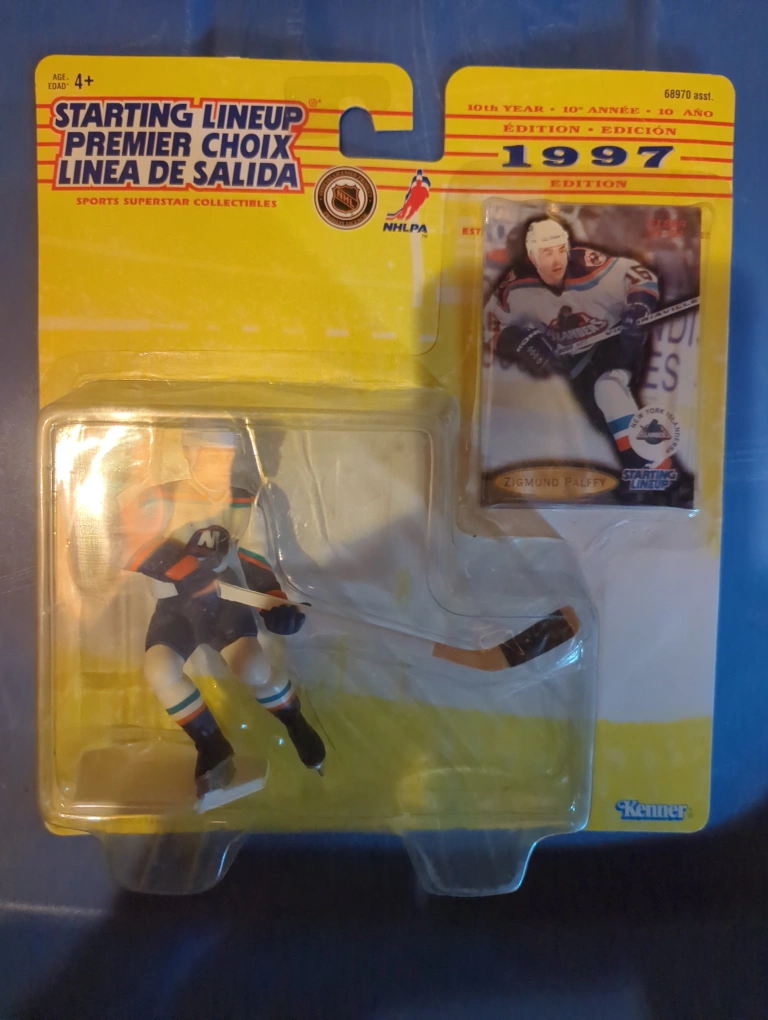 Selling a Starting Lineup figurine of Zigmund Palffy from the 1997 Edition! This is a sports superstar collectible from the NHLPA and is still in its original packaging. It's from Kenner and is suitable for ages 4+