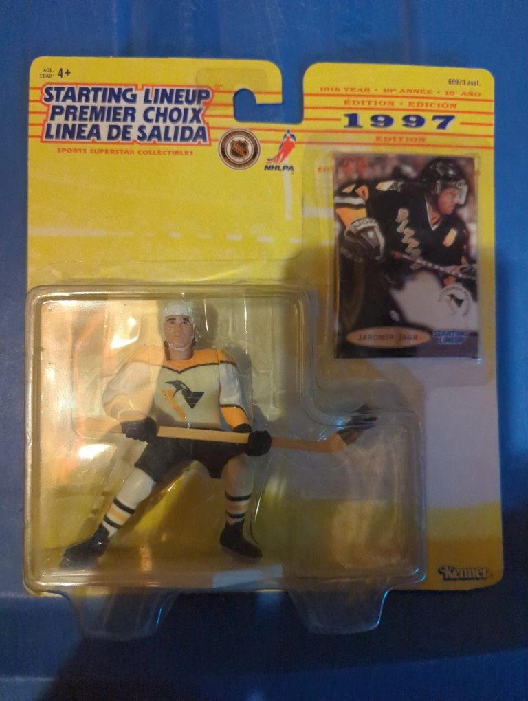Selling a Jaromir Jagr Starting Lineup figure from the 1997 Edition! It's still in its original packaging. This is a great collectible for any hockey fan, especially those who admire Jaromir Jagr. Recommended for ages 4 and up!