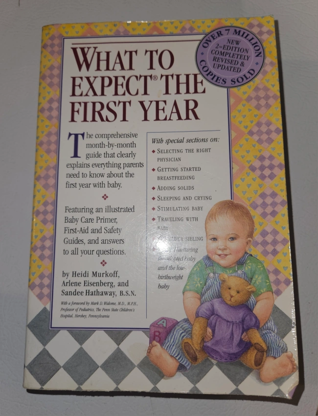 'What to Expect the First Year' book. This comprehensive guide clearly explains everything parents need to know about their baby's first year. It features an illustrated Baby Care Primer, First-Aid and Safety Guides, and answers to all your questions. Perfect for new parents!
