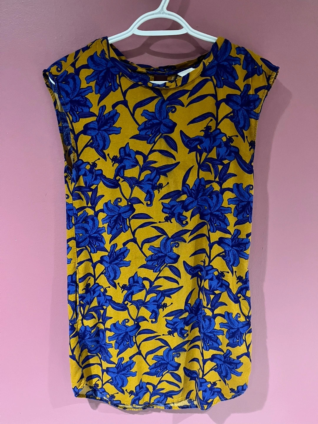 This is a sleeveless dress with a vibrant floral pattern. The dress features a yellow background with a blue floral design. It's perfect for a casual day out or a summer event. The material feels lightweight and comfortable.