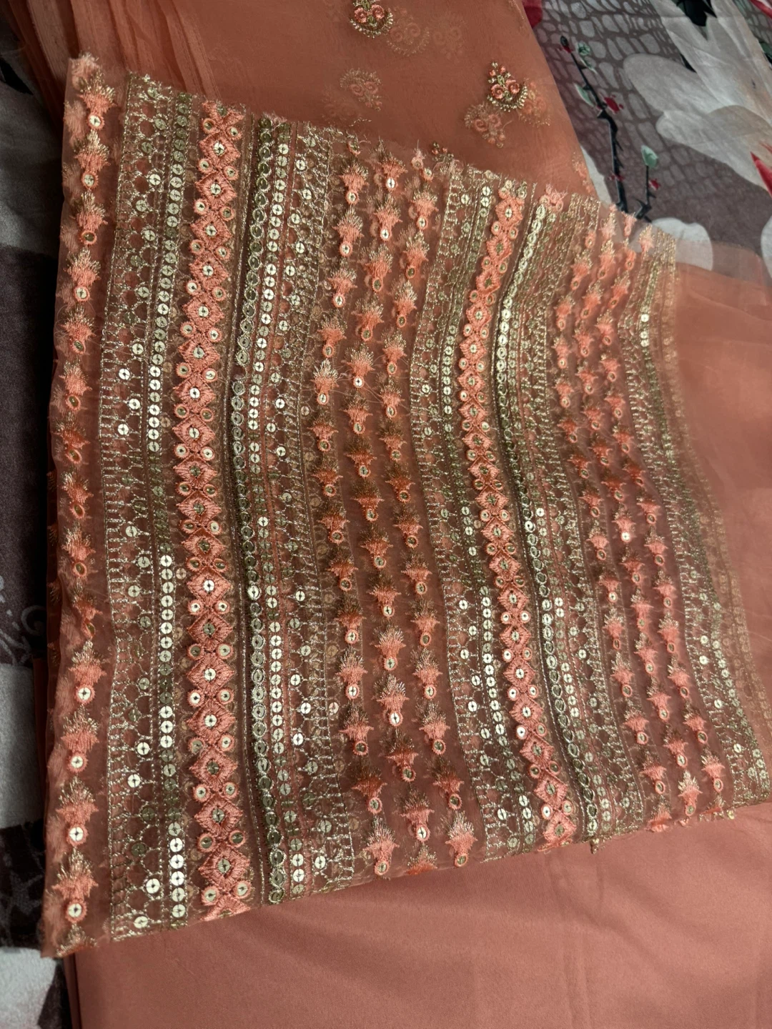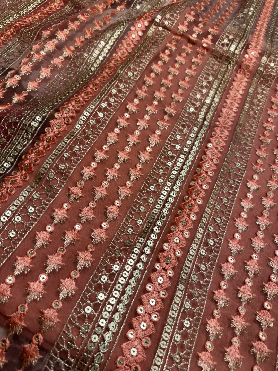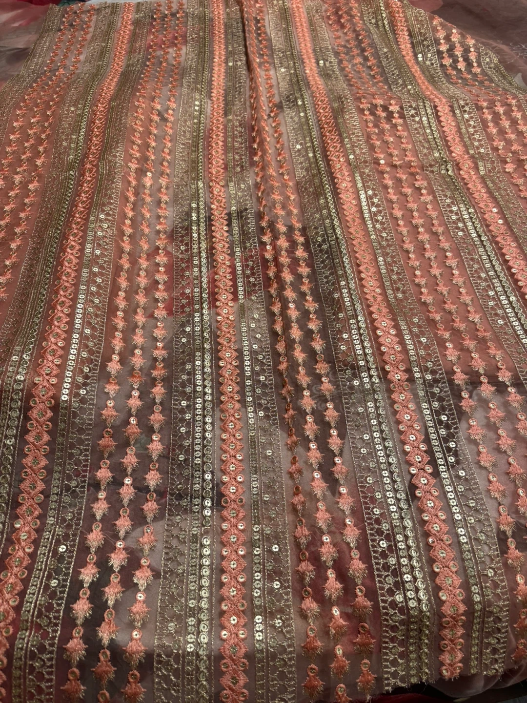 Beautiful peach-coloured fabric with intricate embroidery and sequin detailing. Perfect for creating a unique garment or adding a touch of elegance to your next sewing project