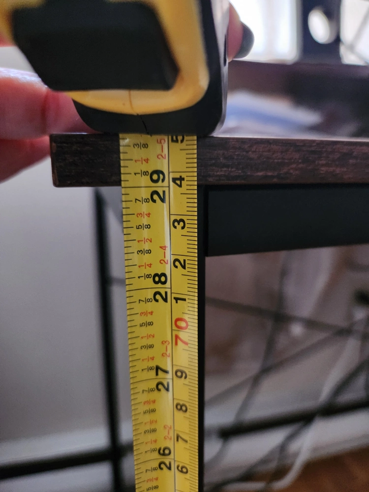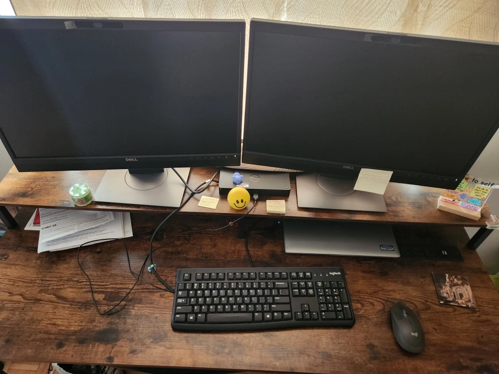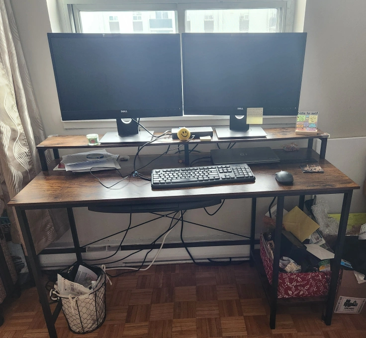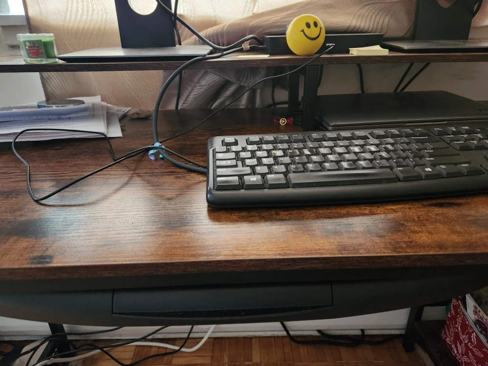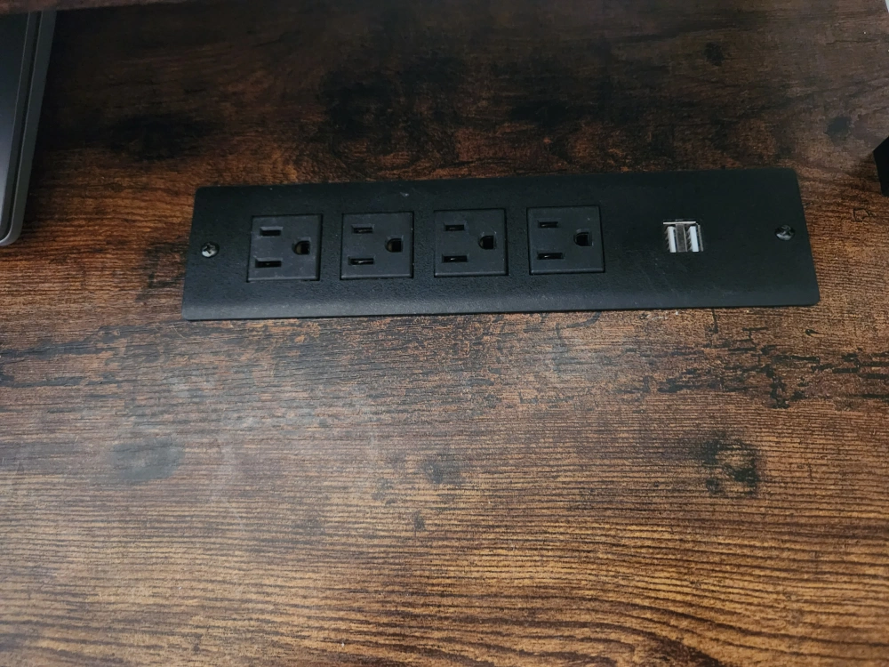 Selling a computer desk with a woodgrain finish. It has a shelf for extra storage or display. The desk measures approximately 54 inches in length and 29 inches in height. It also features a built-in power outlet and USB ports. No scratches or damage, mint condition. Selling because I'm moving and need to get a smaller size.