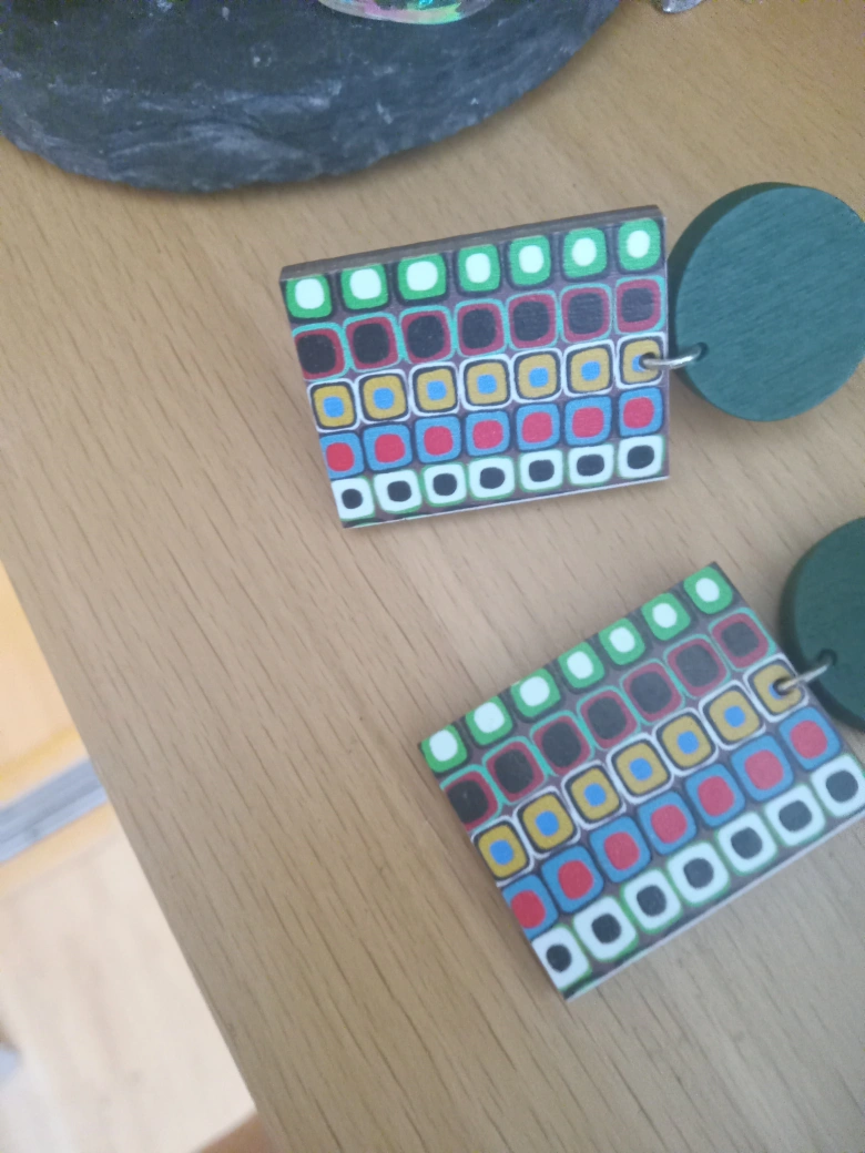 Check out these unique, handmade wooden earrings! They feature a fun, colourful geometric design with a dark green circular top piece. Perfect for adding a pop of colour to any outfit!