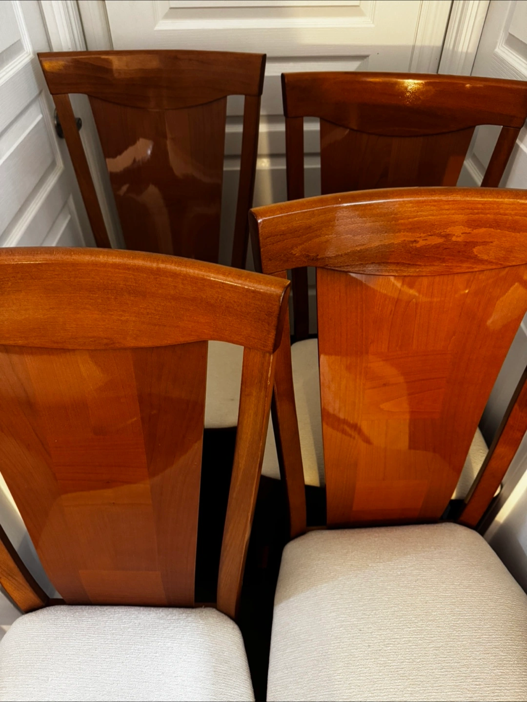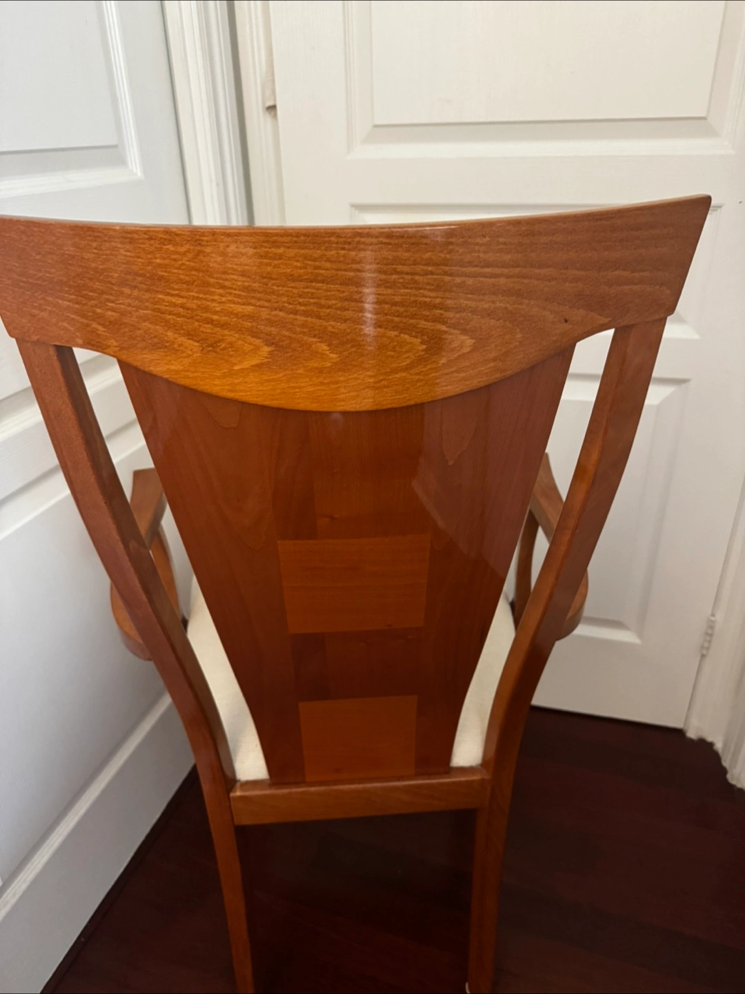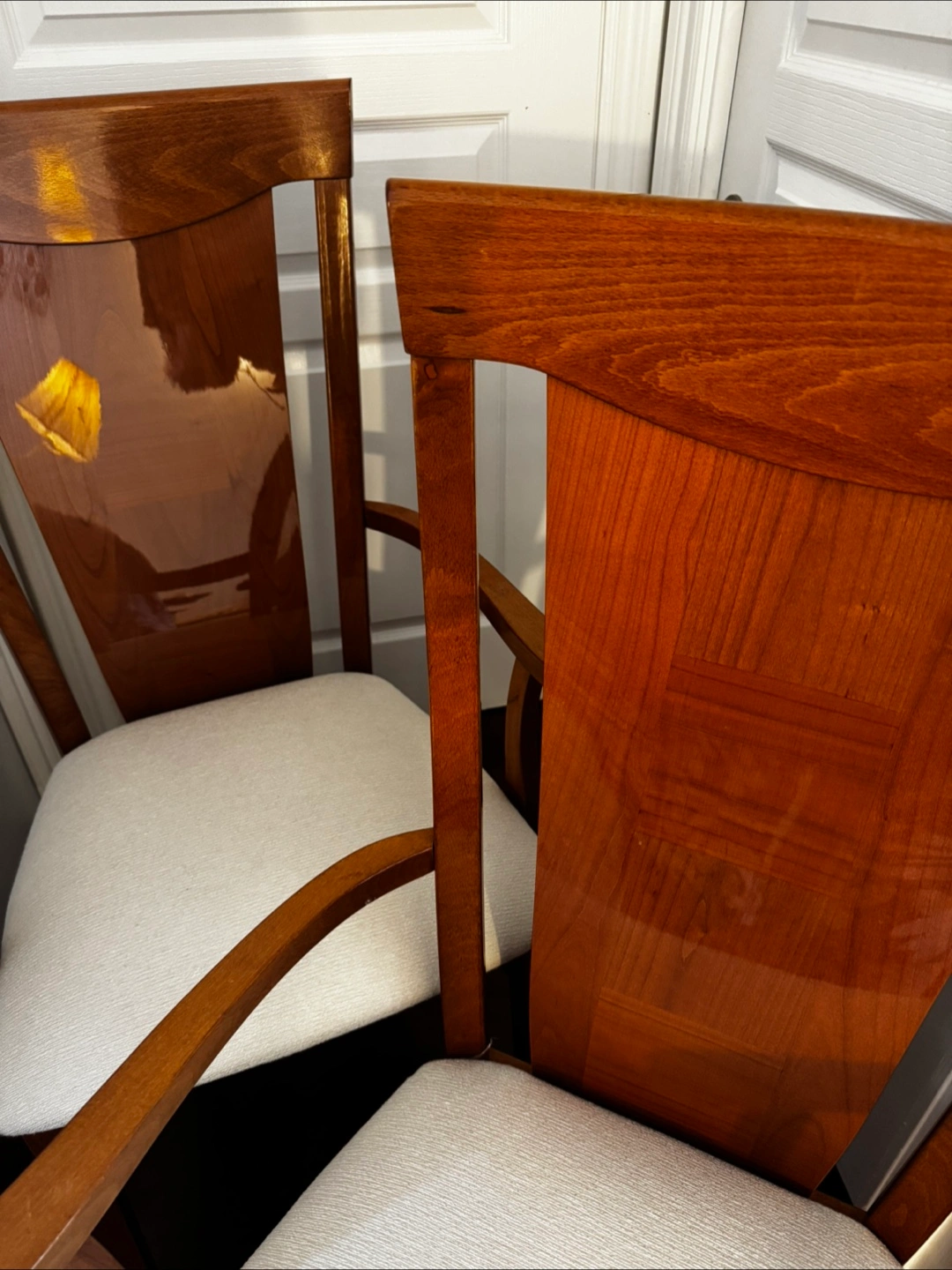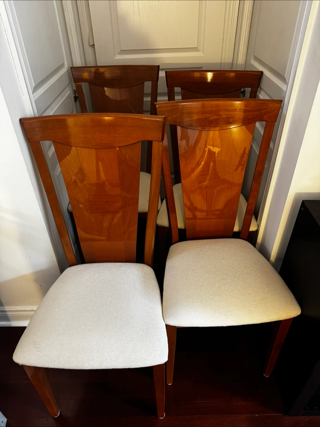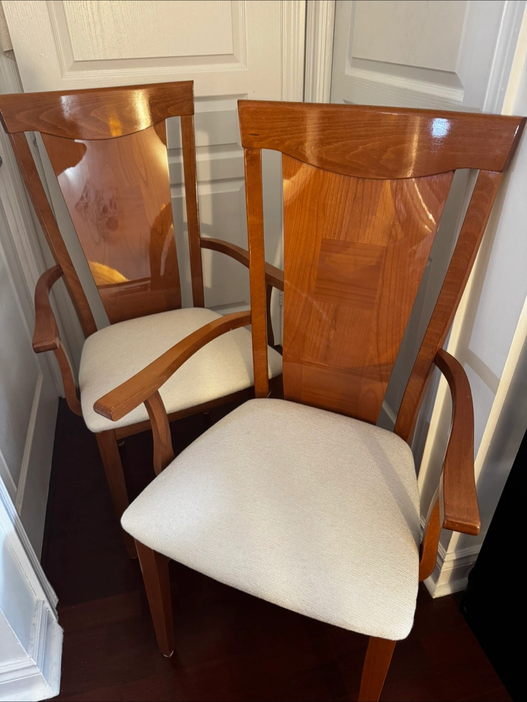 These are 6 Italian dining chairs with a beautiful wood finish and neutral-toned fabric seats. They are sturdy and stylish, perfect for upgrading your dining space, they are in like new condition , 4 without handles and two with handles. * Chair Style: Dining * Number of Chairs:6 * Material: Wood frame with fabric seat * Colour: Wood and Beige . If you're reading this, yes, they're still available! $150 Yonge and finch area