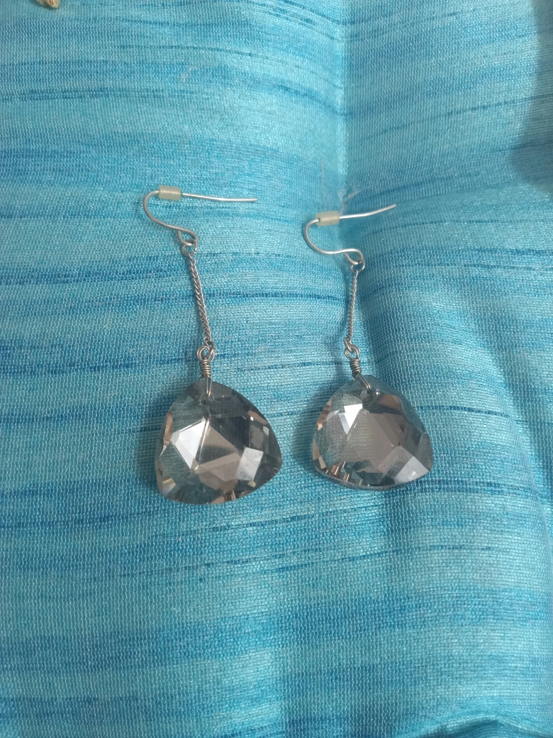 These are a pair of dangling earrings. They feature a silver chain and a crystal pendant in a triangular shape. They are in great condition!