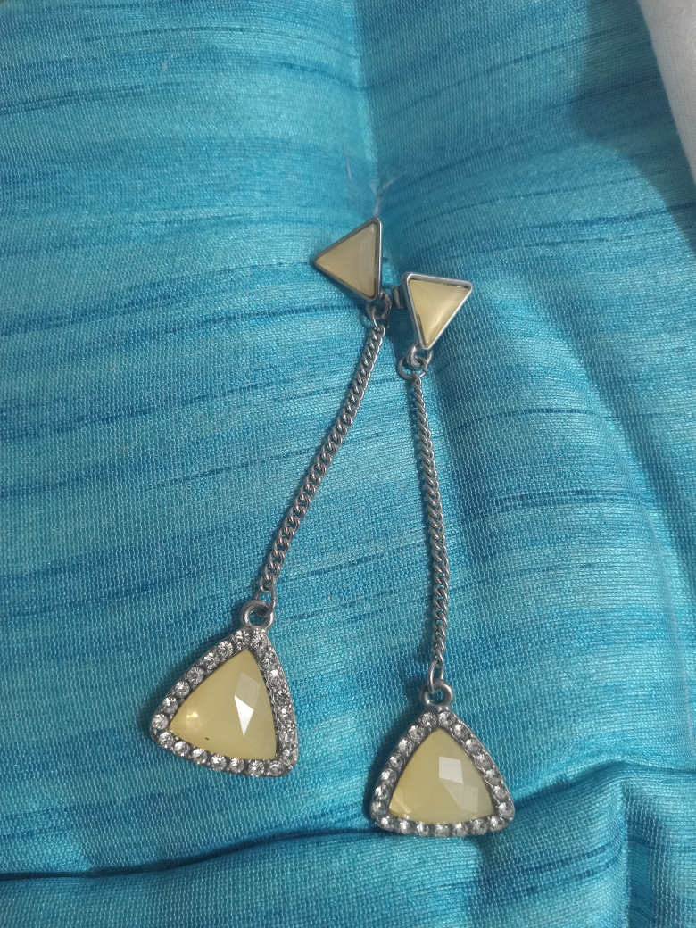 Cute triangle dangle earrings with a silver chain. The triangles are a pale yellow colour and have rhinestones around the edges. They're in great condition and would be a nice addition to any outfit!