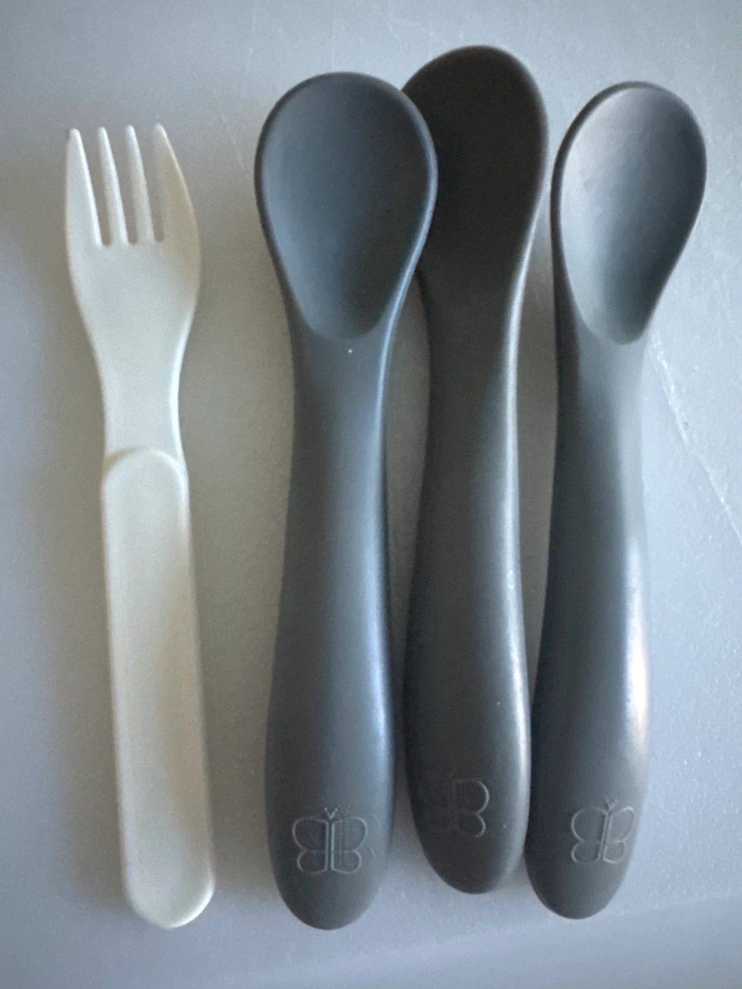 Here's a set of Bumkins baby feeding spoons and a fork! They're in great condition and ready for a new home. Perfect for starting solids and beyond! The spoons are a nice soft silicone, gentle on baby's gums