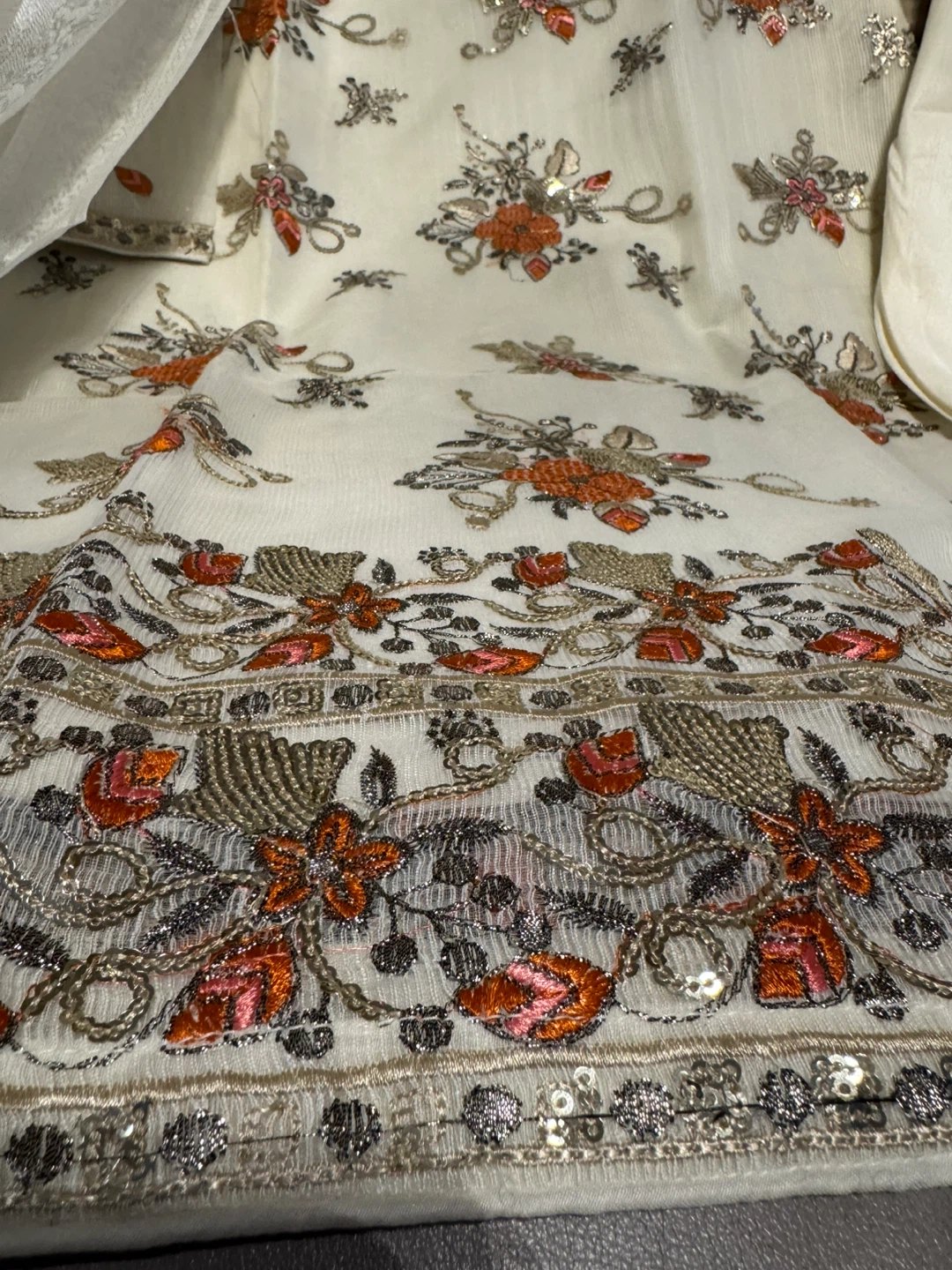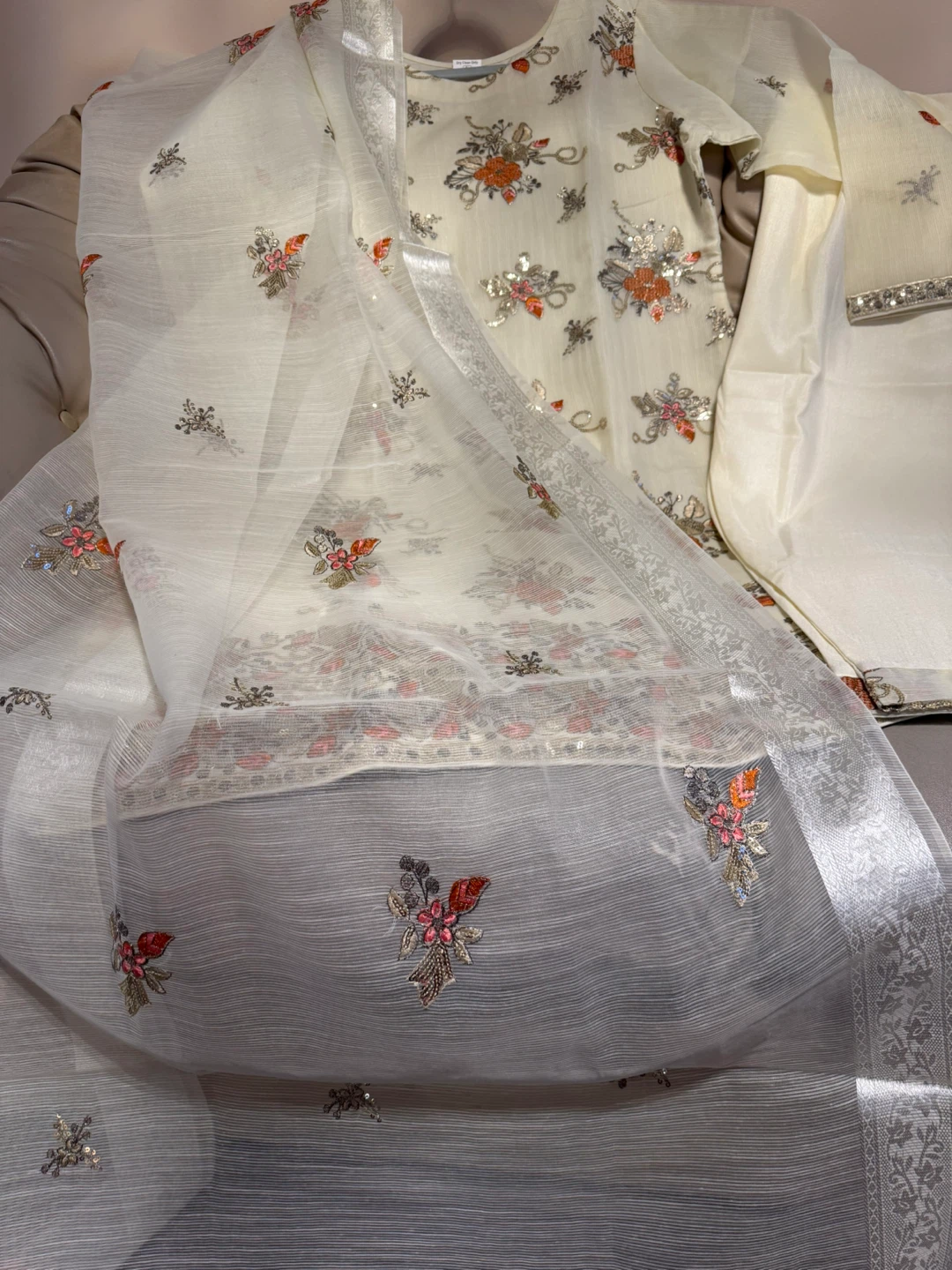 Beautiful salwar kameez suit with intricate floral embroidery and delicate sequin detailing! The fabric has a subtle striped texture, adding to its elegance. Perfect for special occasions or festive wear! The set includes the kameez (top), salwar (pants), and dupatta (scarf).