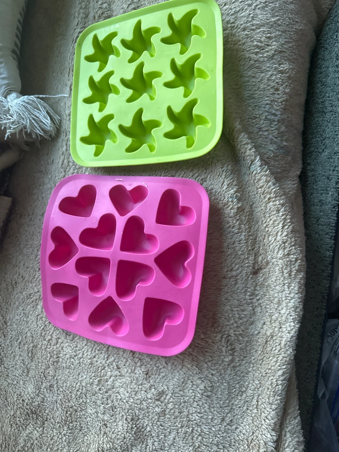 I'm gifting two fun ice cube trays from Ikea! One is a bright green with star shapes, and the other is a cute pink with heart shapes. They're perfect for adding a little something special to your drinks