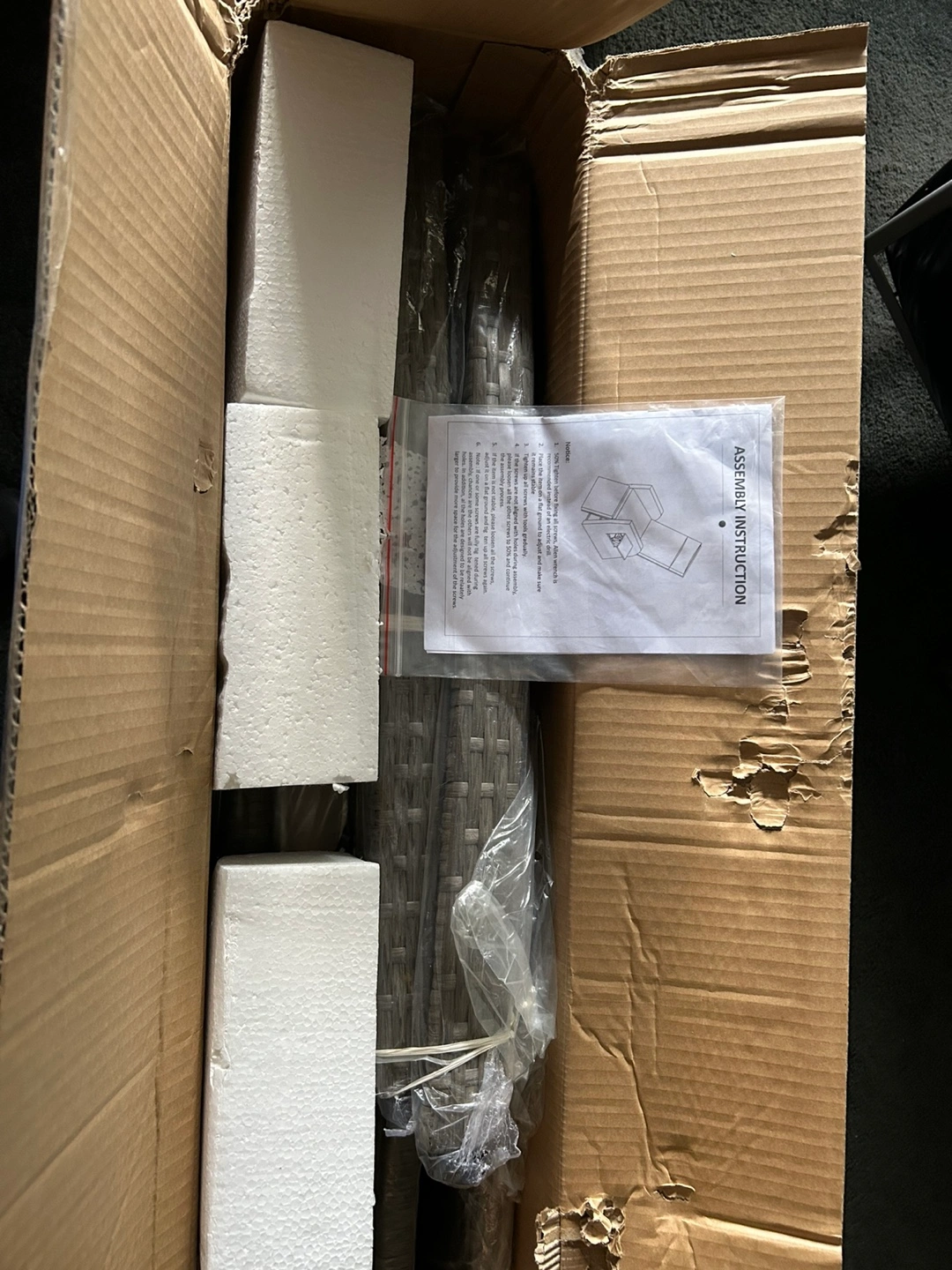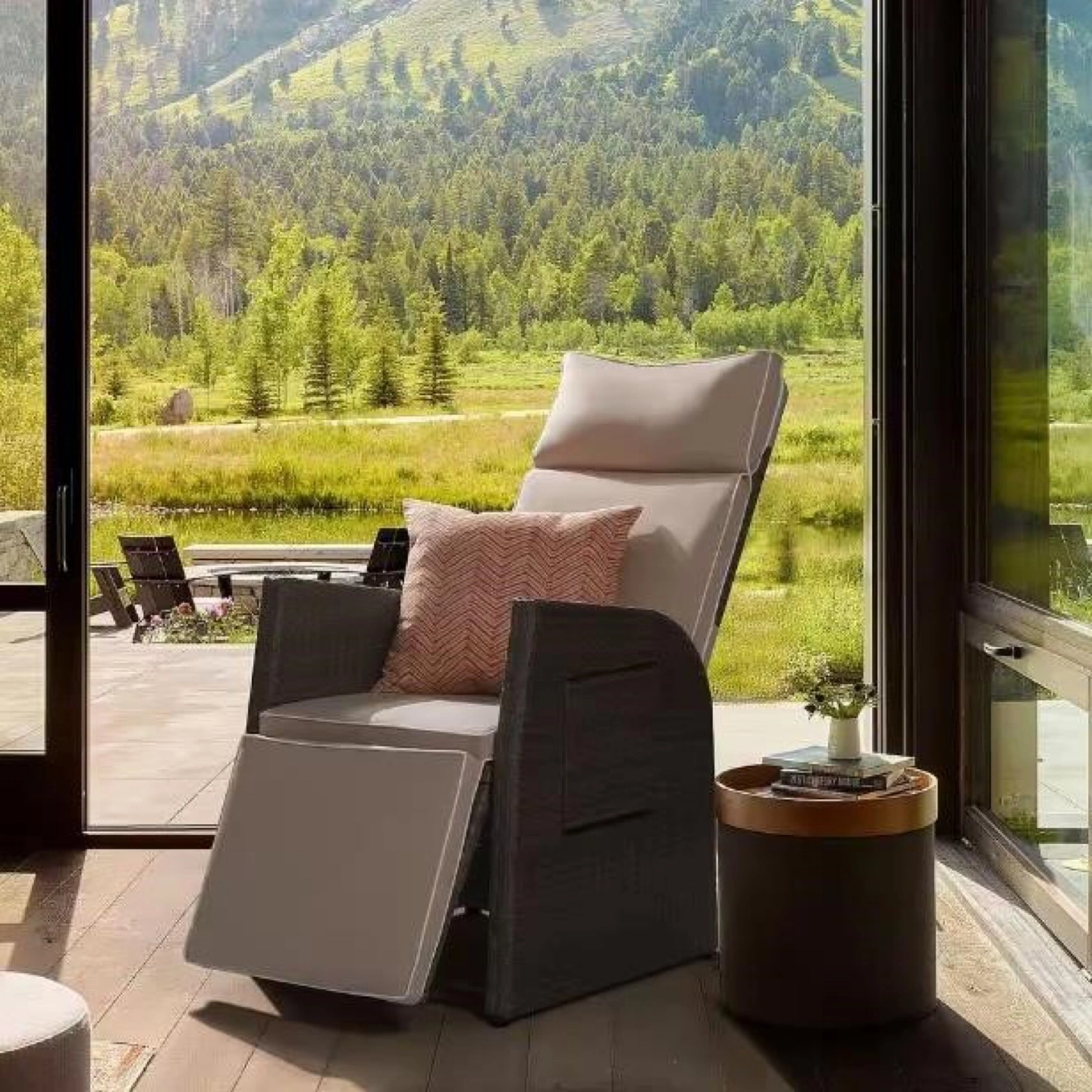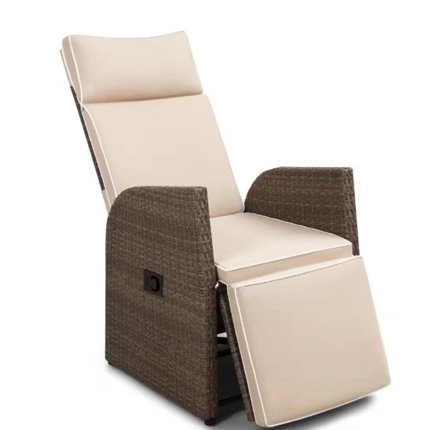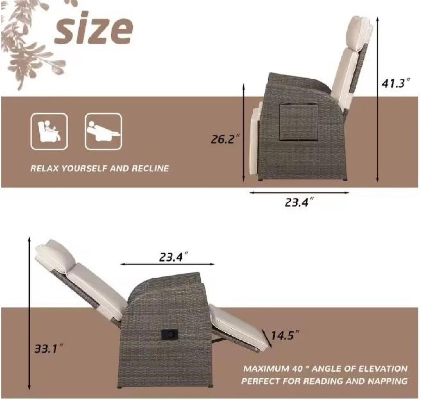 284New in box. Leslie/Hwy 401. Price FIRM. Dimensions: 23.4" D 22.4" W 41.3" H Seat height: 16.3" Seat depth: 20.5" Seat width: 14.6" Back height: 27" Back width: 18.3" Cushion thickness: 2.8" Weight: 34.7lb Capacity: 330lb Designed for comfort and durability in any weather. Sturdy steel frame and PE rattan wicker construction provide lasting support, while the UV-protected polyester cushion ensures relaxation with minimal maintenance. The adjustable backrest and footrest let you choose your preferred lounging position with ease. Double armrests feature a built-in tray for holding drinks or snacks, adding convenience to your leisure time. Whether on the patio, balcony, or garden, this recliner elevates your outdoor seating experience.