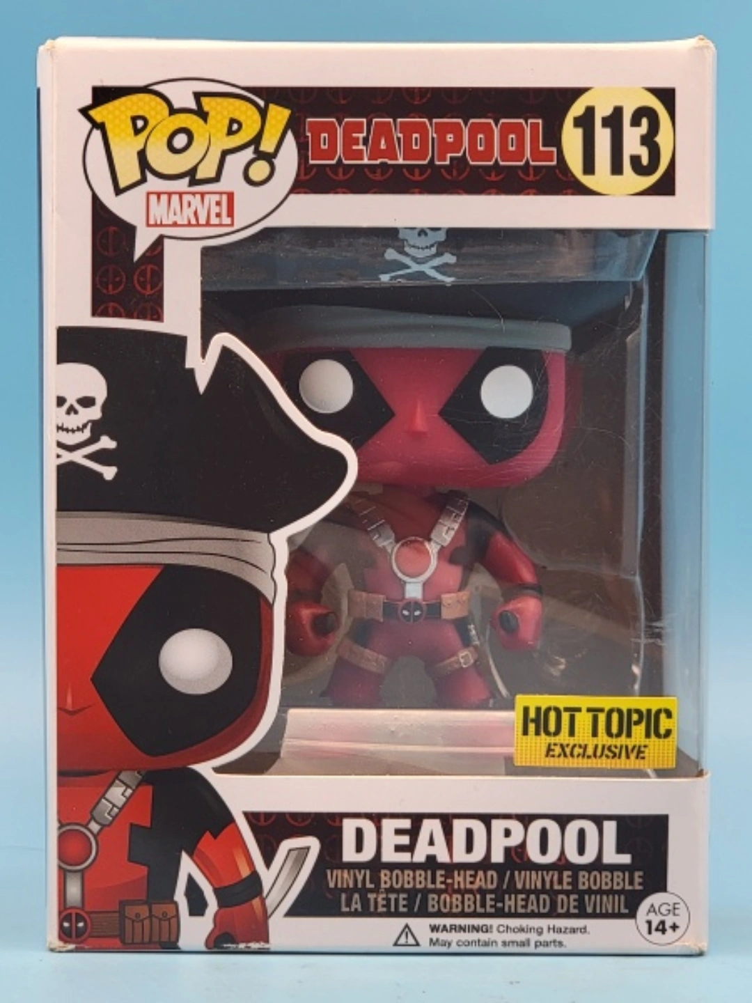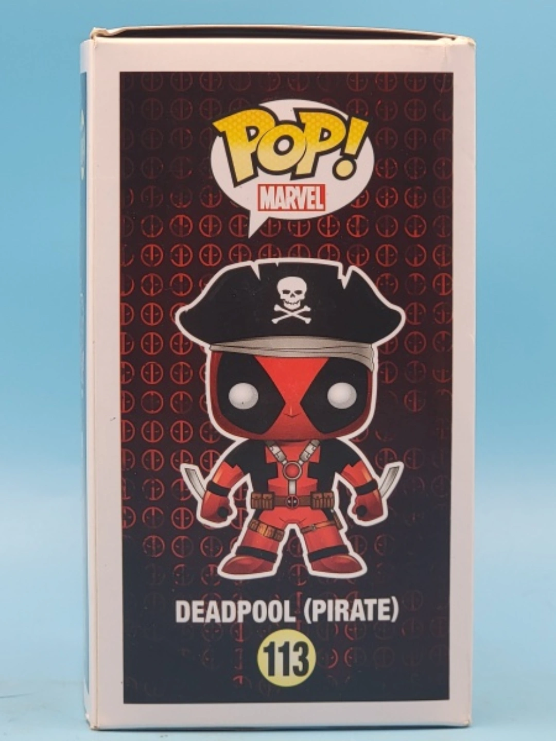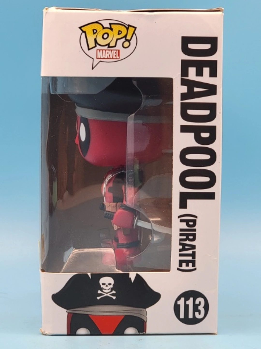Up for grabs is a Funko Pop! Marvel figure of Deadpool dressed as a pirate! This is number 113 in the series and is a Hot Topic Exclusive. The box is included and in great shape. A fun addition to any Marvel or Funko collection!