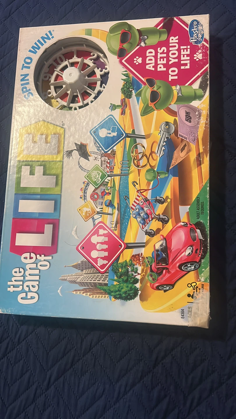 The Game of Life board game by Hasbro Gaming! It's a fun game where you spin to win and add pets to your life. Adult assembly is required. Ready for a new home!