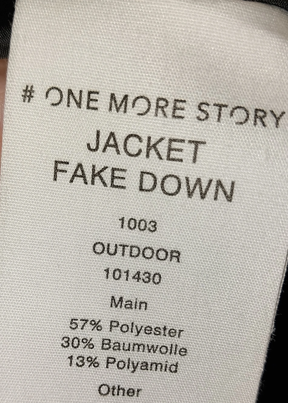 Cozy puffer jacket from One More Story! It's a size 42. The outer material is 57% Polyester, 30% Baumwolle, and 13% Polyamid. Perfect for staying warm on chilly days!