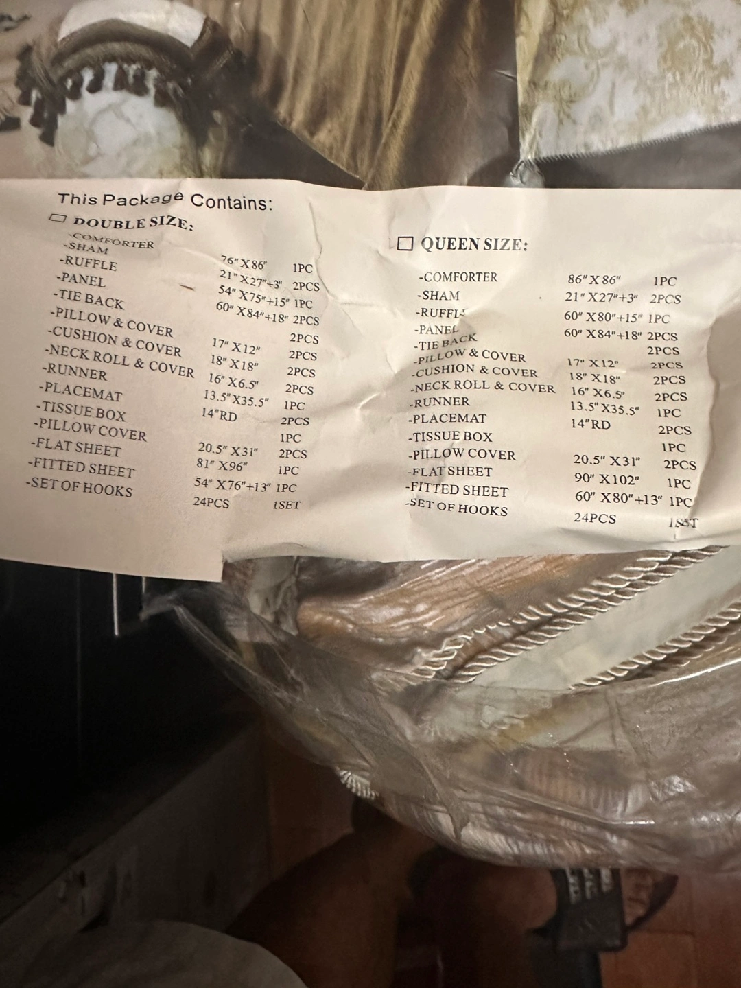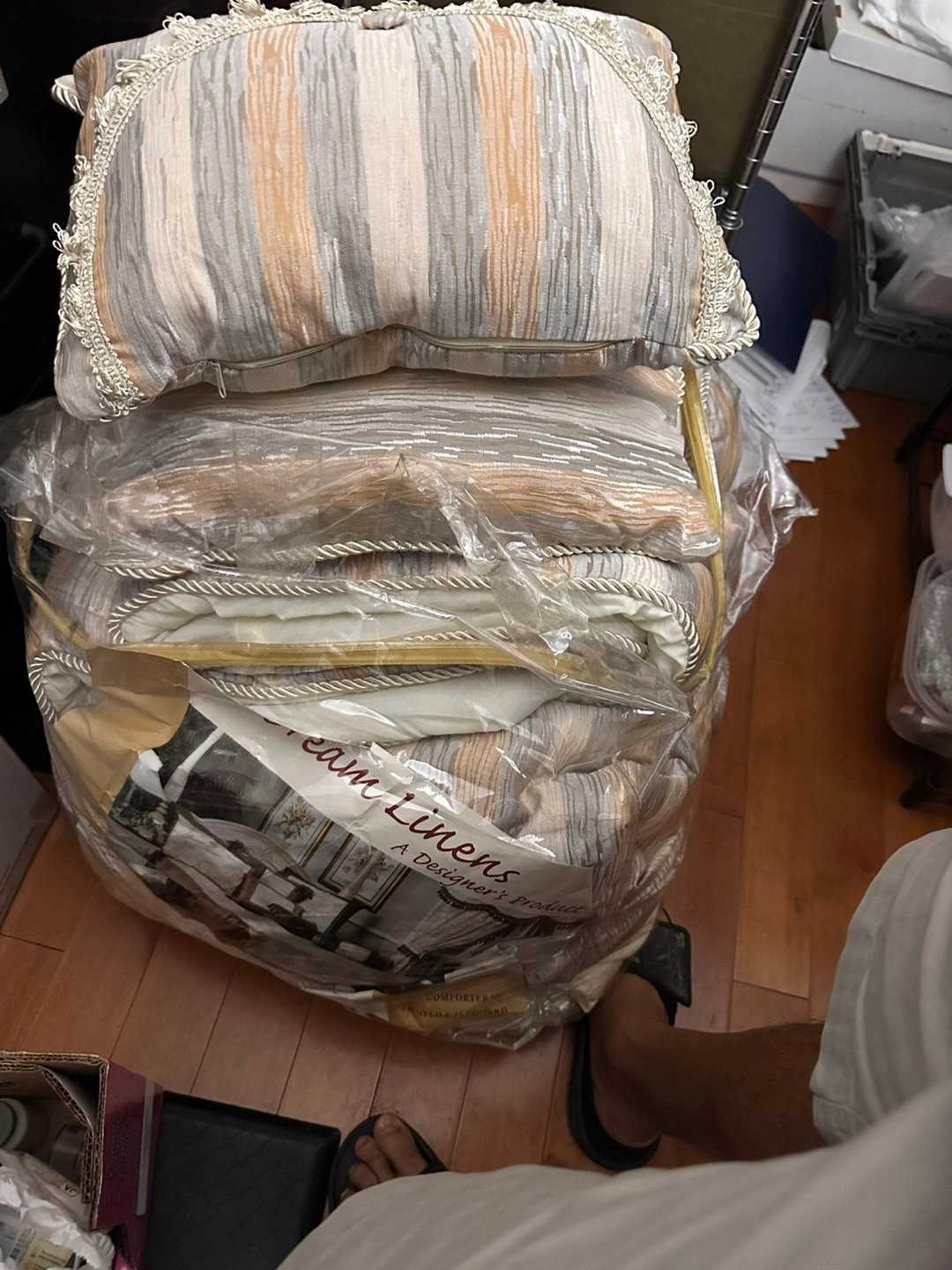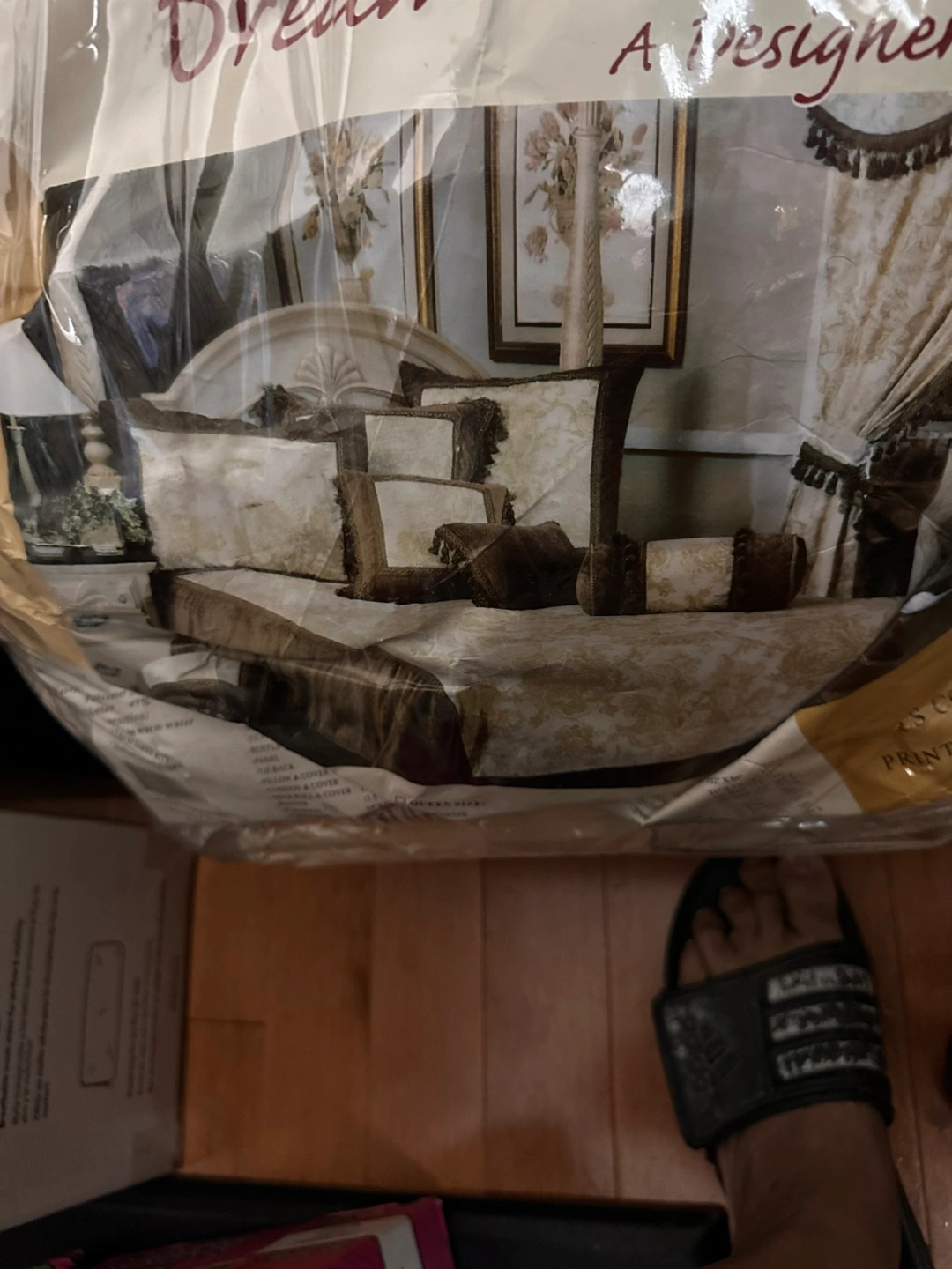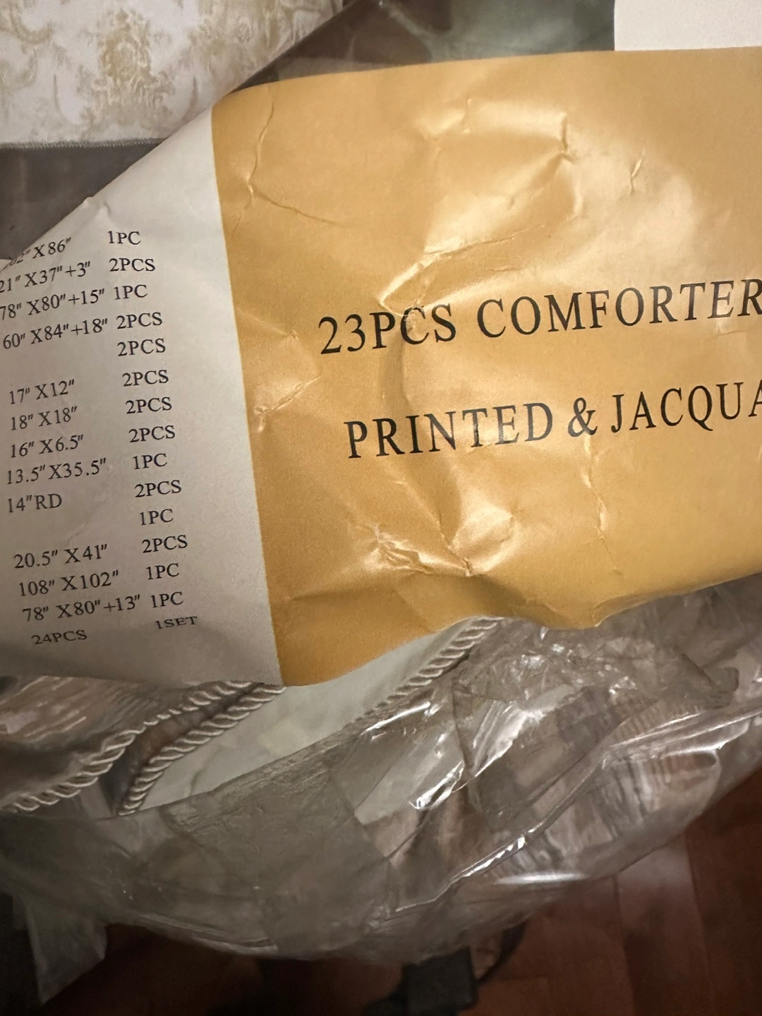 Selling a Dream Linens 23-piece comforter set in queen size! It's a printed and jacquard design. The package includes everything you need to complete your bedding. This set includes: - Comforter - Shams - Ruffle - Bed Skirt - Pillow & Cover - Neck Roll & Cover - Runner - Placemat - Tissue Box - Pillow Cover - Flat Sheet - Fitted Sheet - Set of Hooks Never used