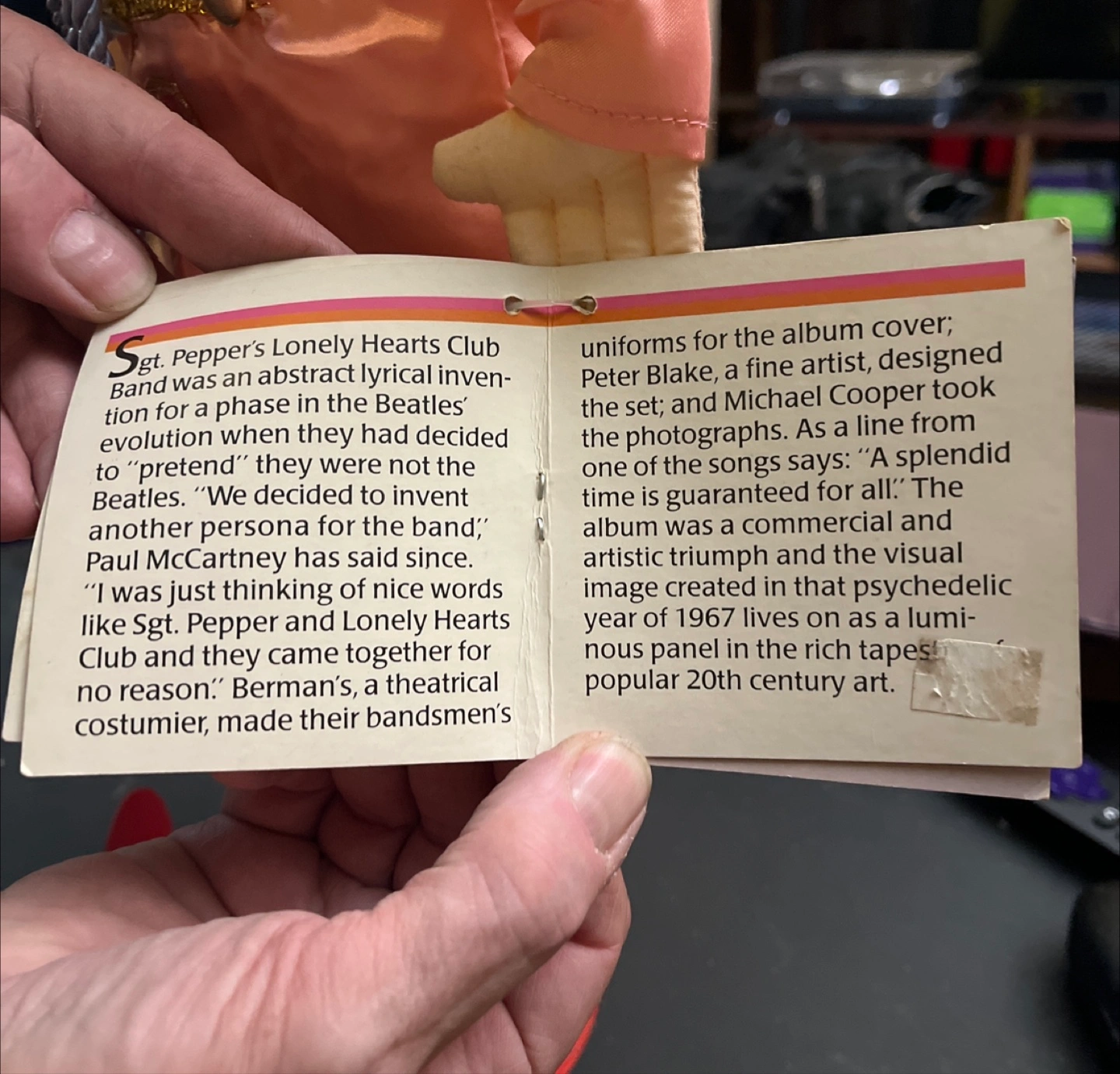 Here's a unique collectible for any Beatles fan! This is the Ringo Applause doll from the Sgt. Pepper's Lonely Hearts Club Band series. It's in great shape and ready to find a new home with a fellow music lover. Smaller space means less places to display.