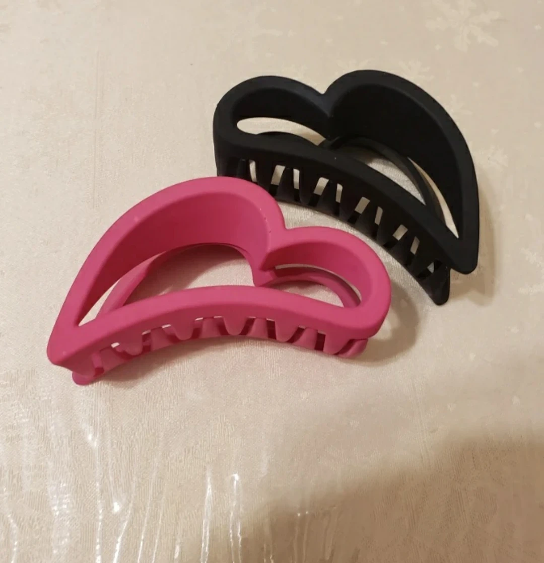 A set of two adorable heart-shaped claw hair clips! One is pink, and the other is black. Perfect for adding a touch of cuteness to any hairstyle. Washed with soap.