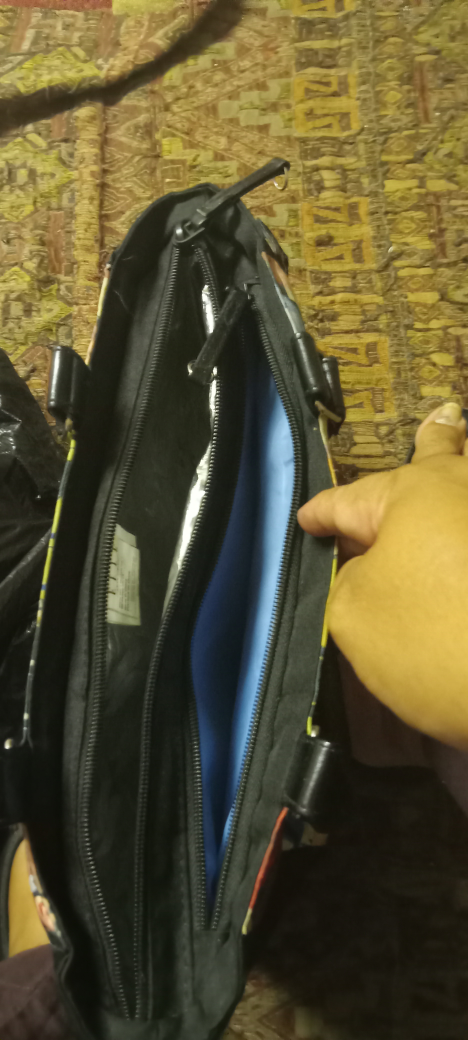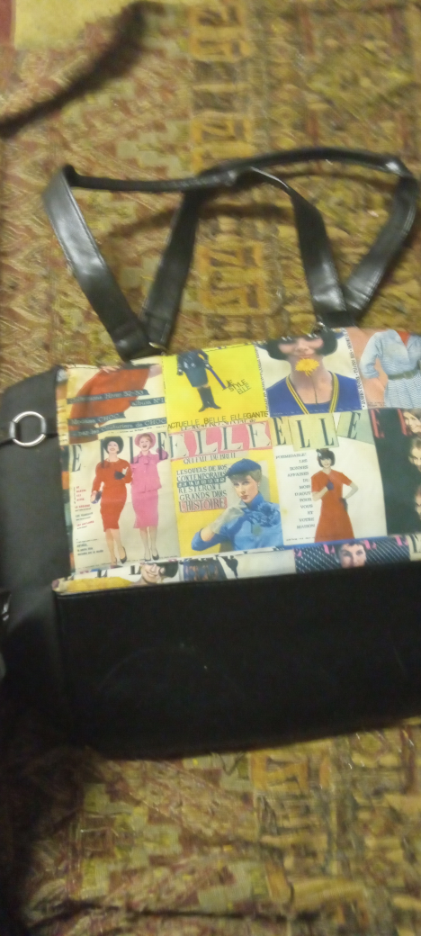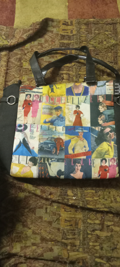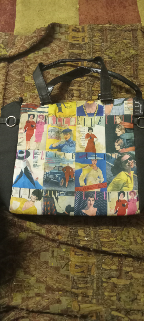 Here's a tote bag featuring a collage of Elle magazine covers! It has black trim and handles, with a spacious interior and multiple compartments. Perfect for carrying your essentials in style