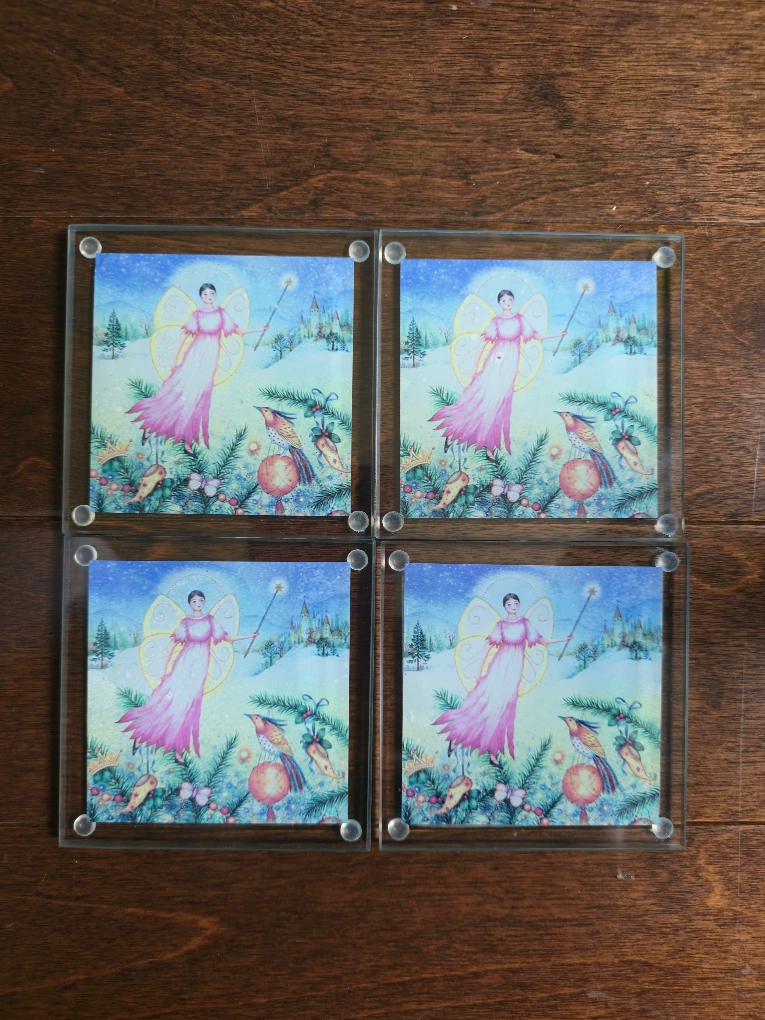 Here's a set of four coasters, featuring a fairy scene.. They're perfect for adding a festive touch to your coffee table or bar area during the holidays