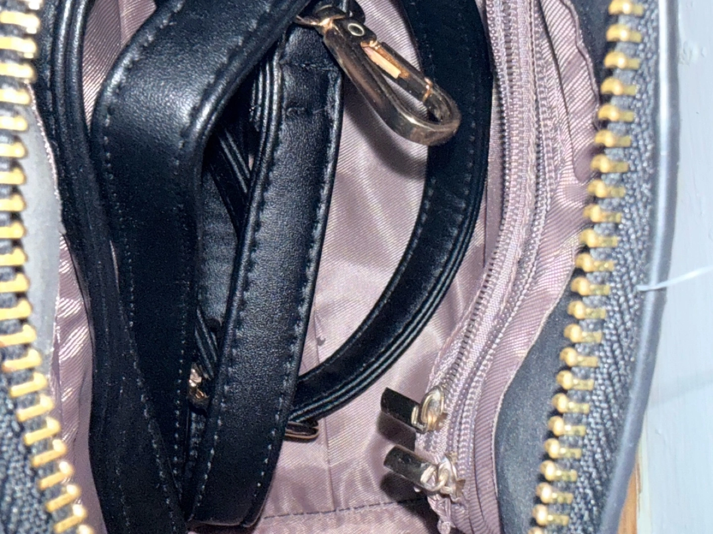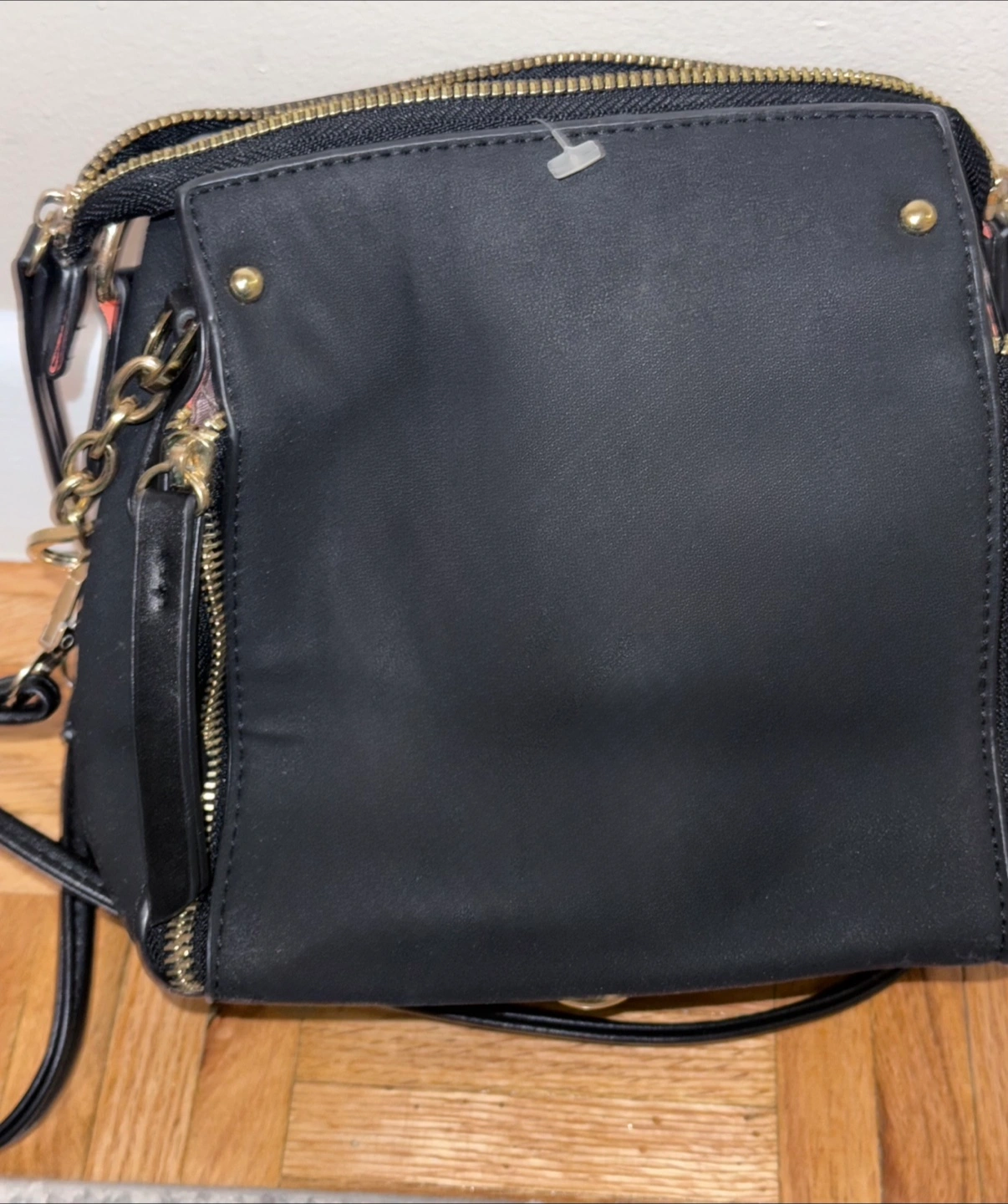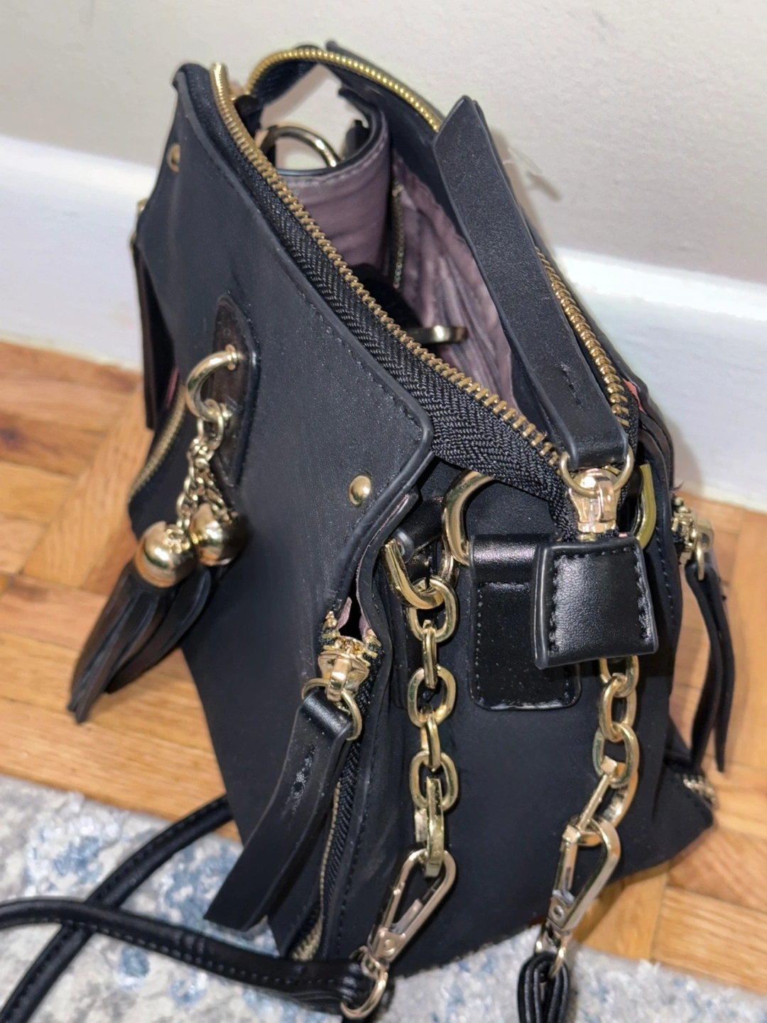 A stylish black handbag featuring chic gold chain accents! It's in great condition and ready for a new owner. Perfect for adding a touch of elegance to any outfit.