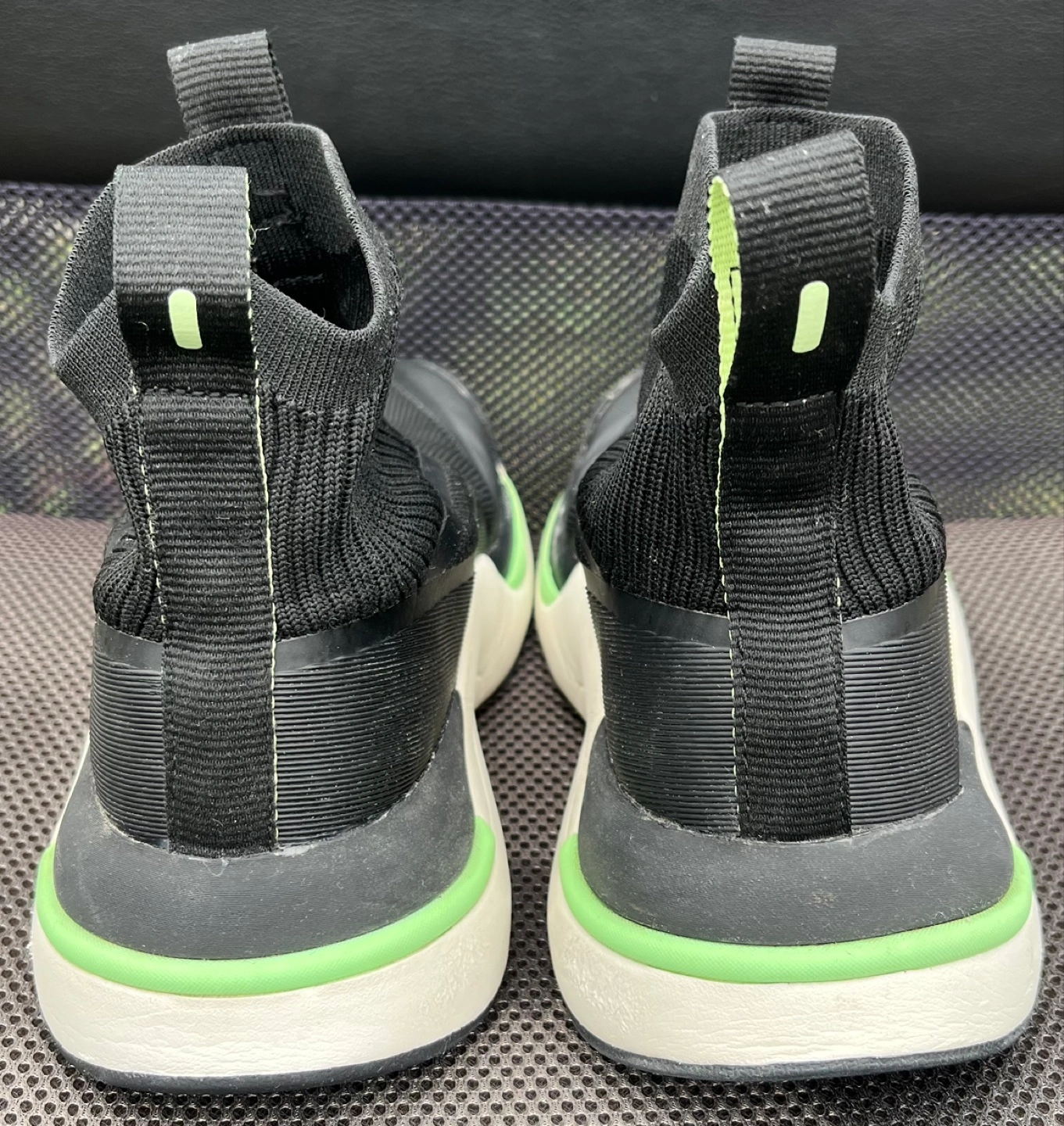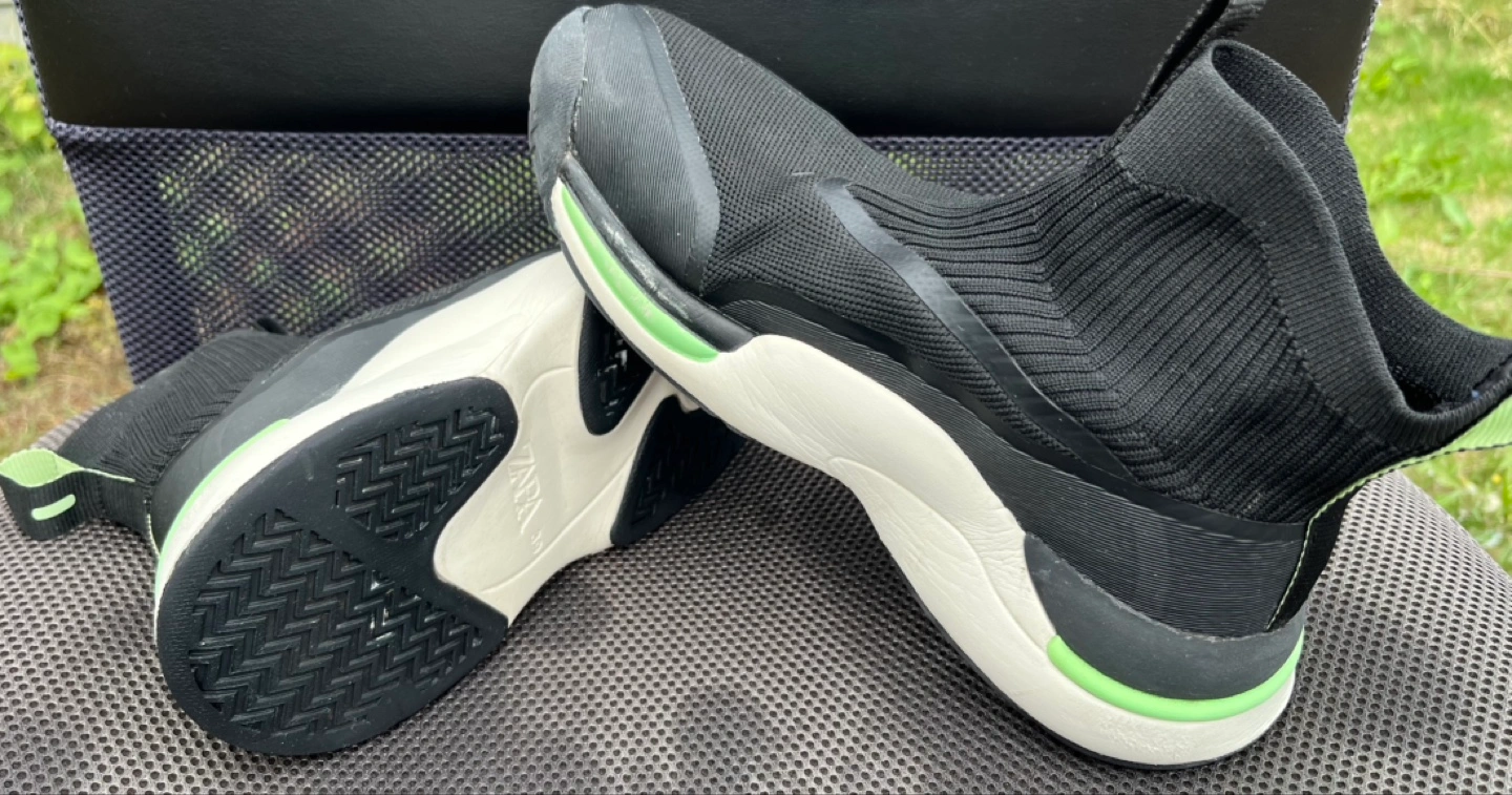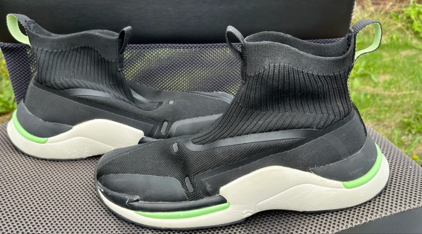 This pair is in fair condition and the price reflects it. It has been worn more than others, and this shoe has stood up to use. Plenty of tread left, reflective neon green striping and on the back shoe loop. As this is a sock style shoe, socks are optional (although he always wore socks with these shoes). Memory foam insole. Sturdy.