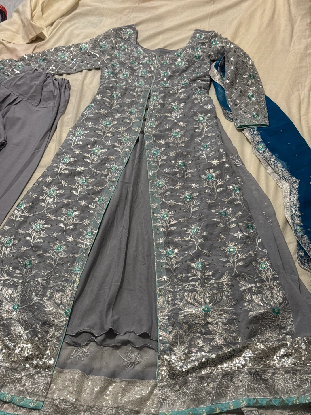 Selling a beautiful grey salwar kameez with intricate embroidery. Includes the kameez (top), salwar (pants), and dupatta (scarf). Perfect for special occasions! Worn just once!
