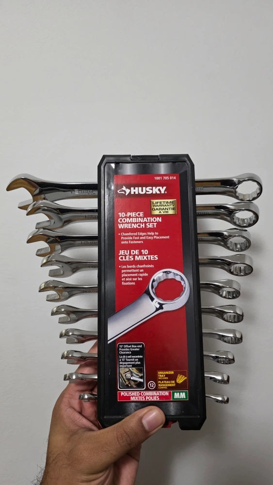 Selling a Husky 10-piece combination wrench set! It features chamfered edges to help provide fast and easy placement onto fasteners. The set includes an organizer tray, too. Used only twice.