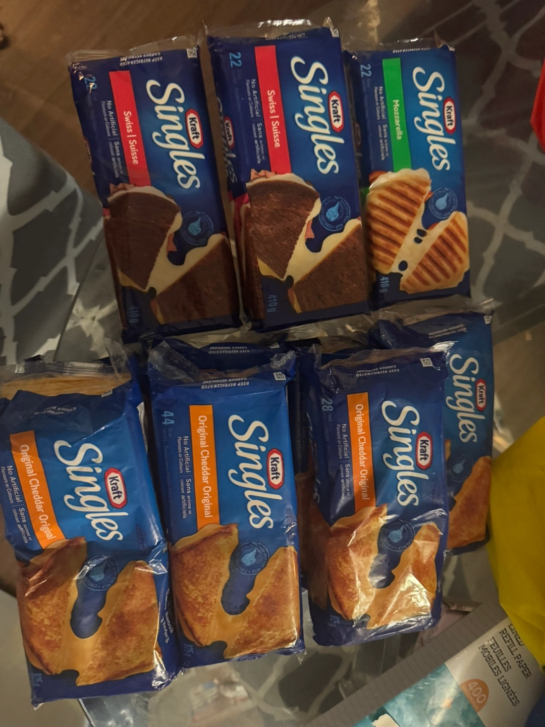 Big packs 4.50 Smaller packs 3.00 Expiry 2026 Selling a variety of Kraft Singles! - Swiss - Mozzarella - Original Cheddar Perfect for grilled cheese or a quick snack