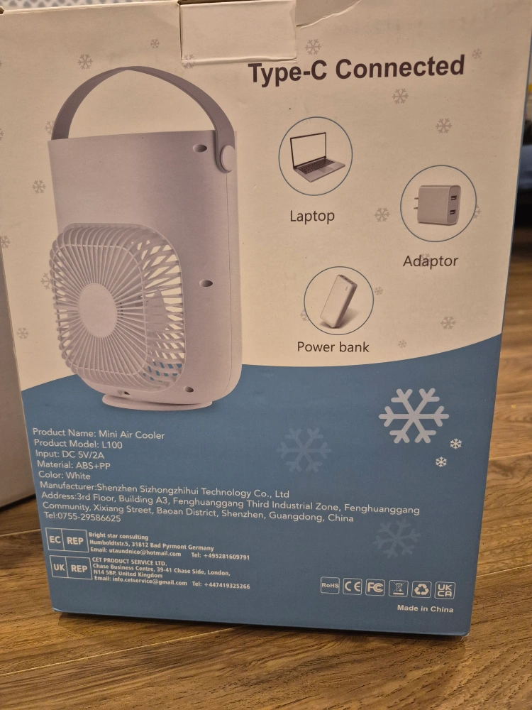 Keep cool with this mini air cooler! It's super portable and easy to use, perfect for small spaces. - Model: L100 - Input: DC 5V/2A - Material: ABS+PP - Colour: White - Type-C Connected pick Scarborough or oshawa