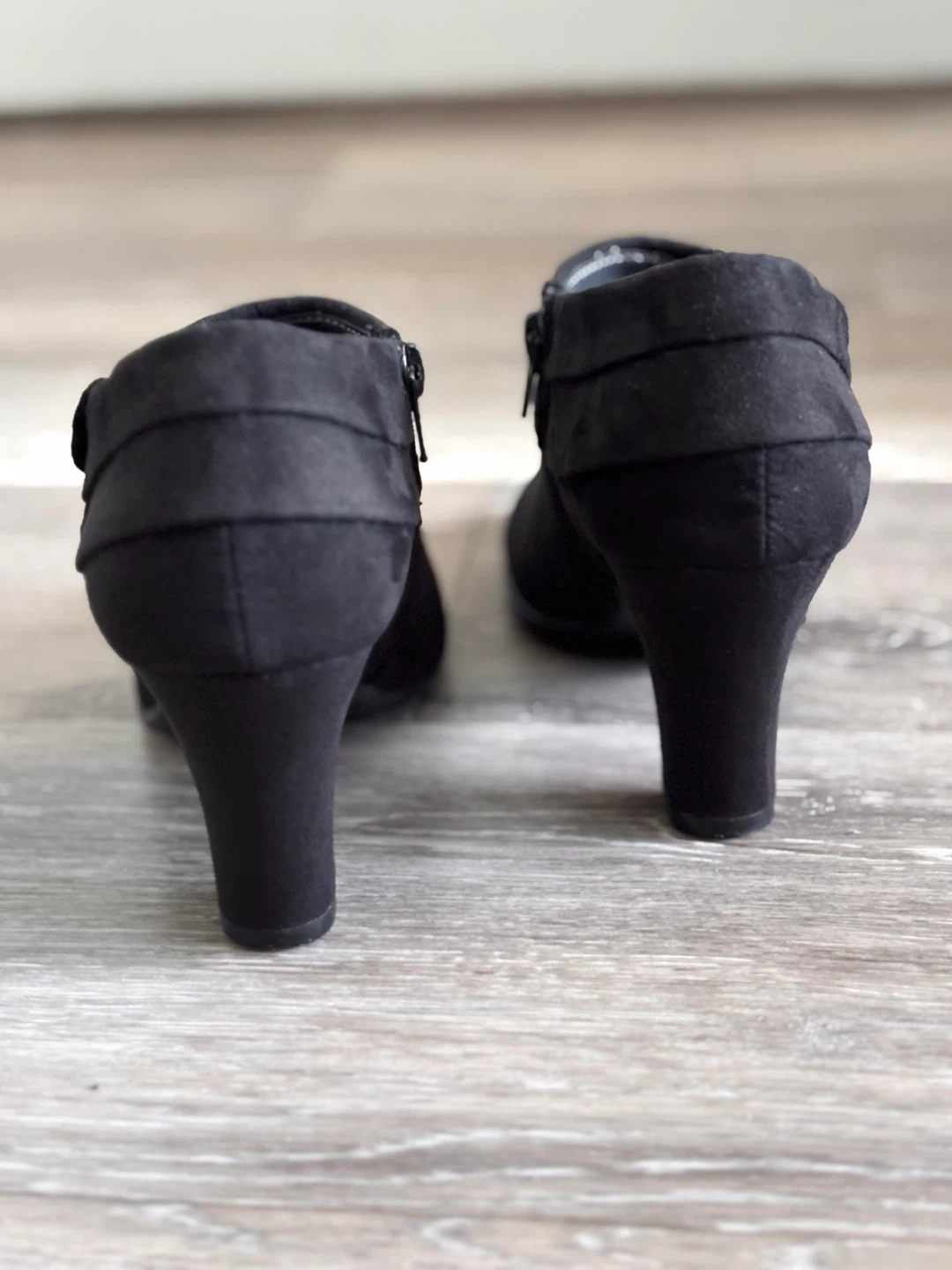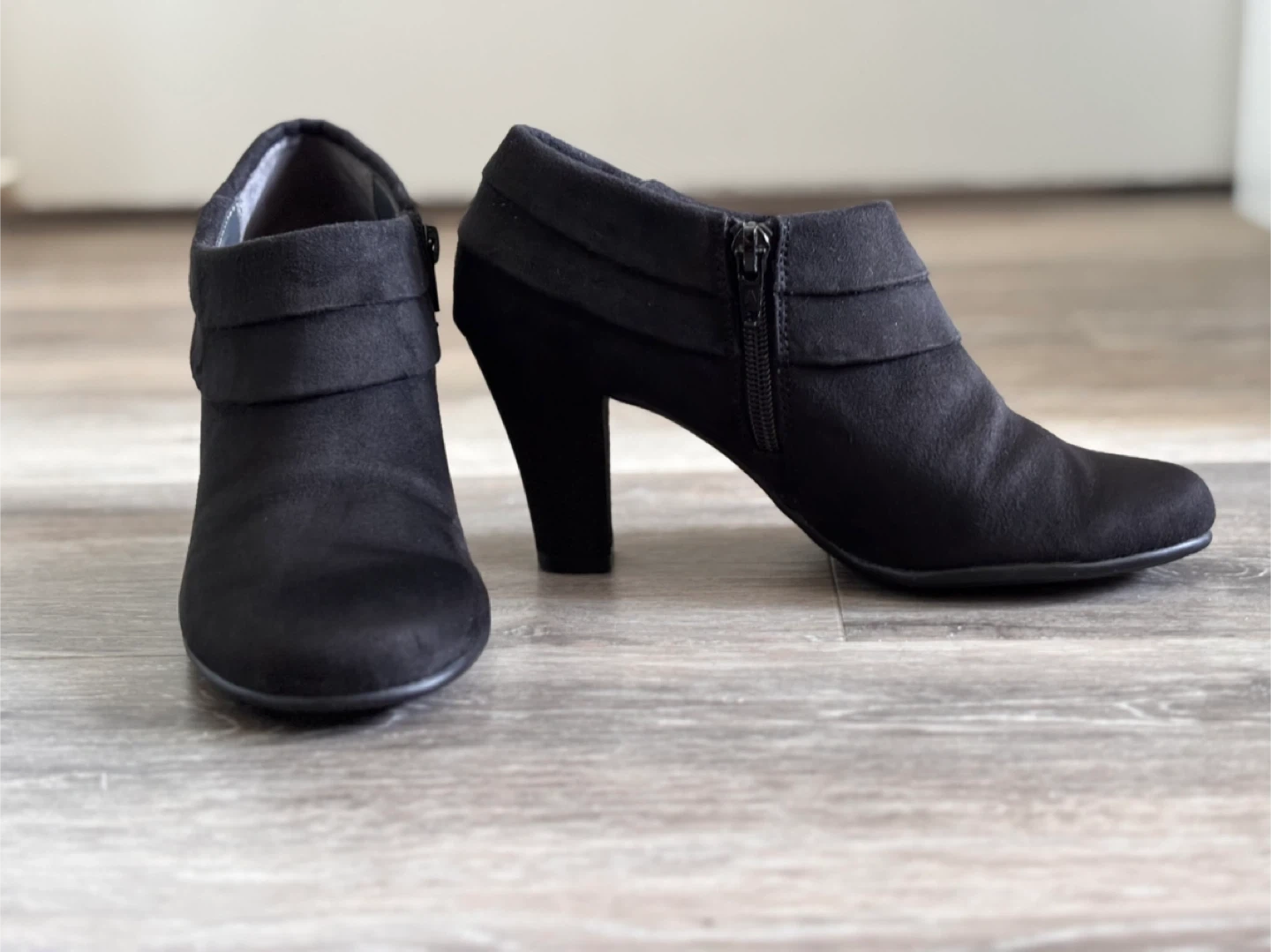 Selling a pair of black suede ankle boots in great condition! They feature a stylish design with a side zipper for easy wear. Perfect for dressing up or down, these boots are a versatile addition to any wardrobe.