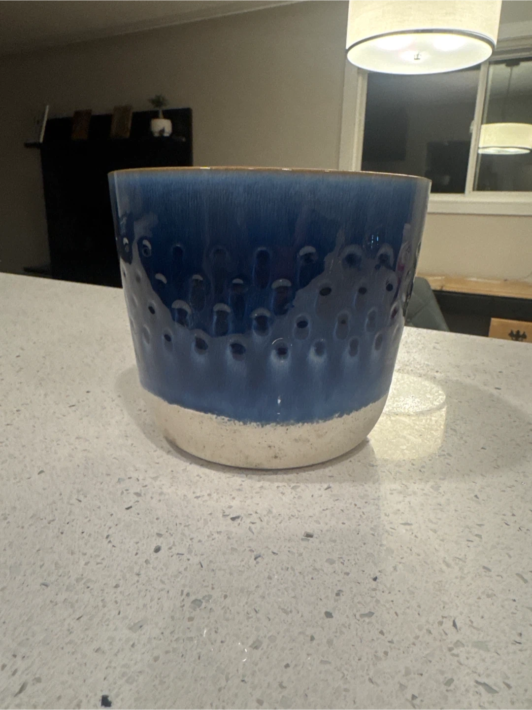 Giving away a lovely blue ceramic planter. It has a unique textured design and a contrasting base. Perfect for adding a touch of colour to your home!