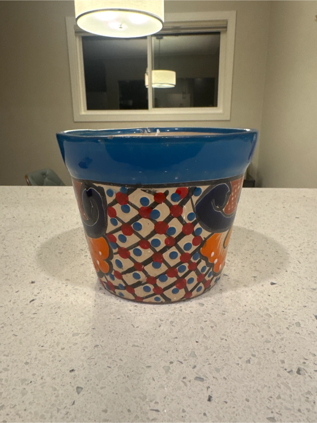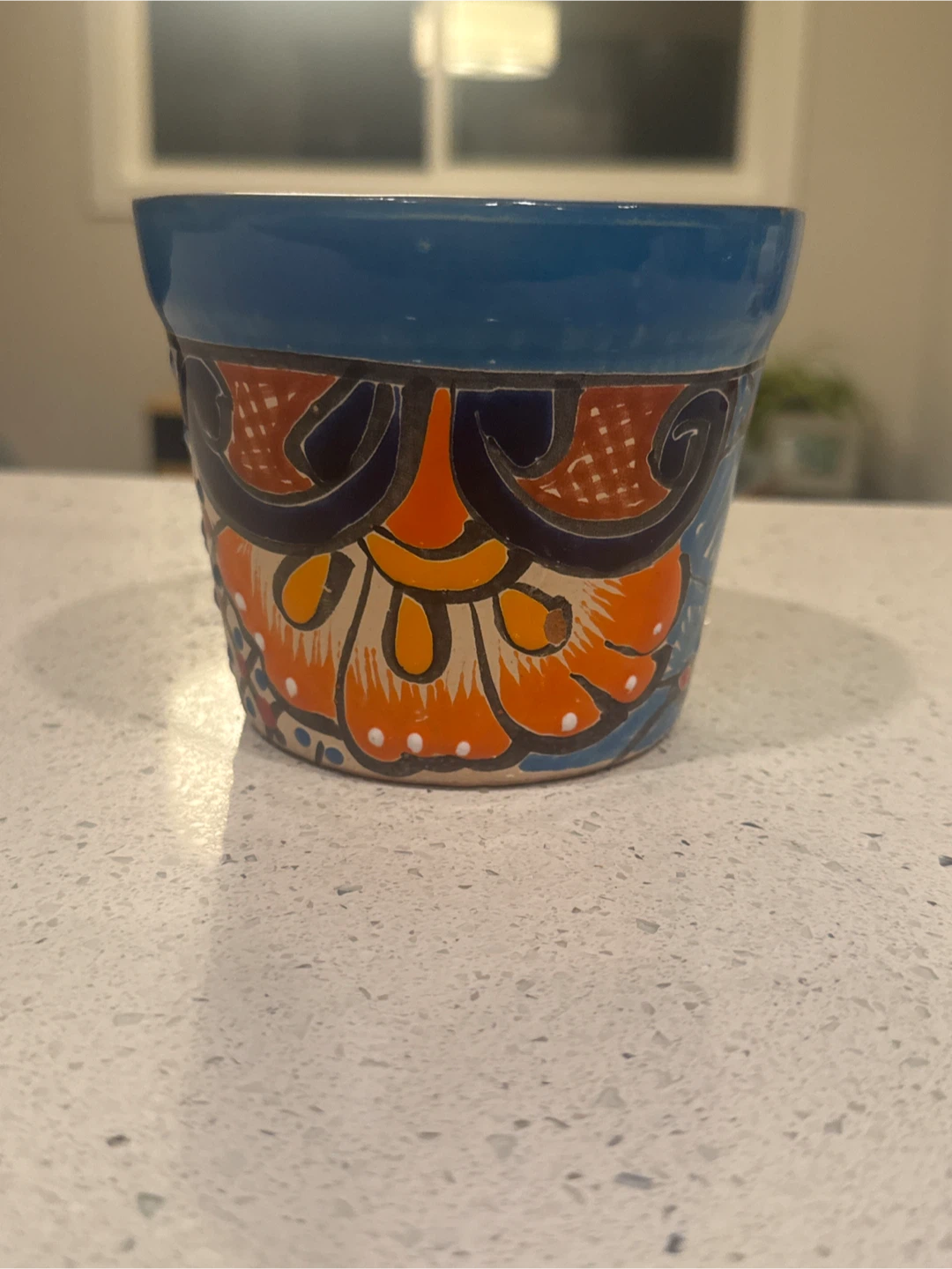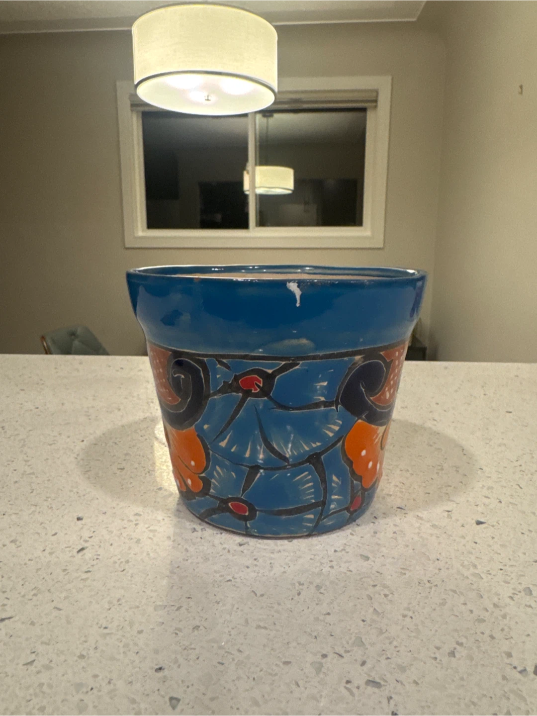 Lovely hand-painted ceramic flower pot. It features a vibrant blue glaze with colourful floral designs around the body. Perfect for adding a touch of charm to your home or garden!