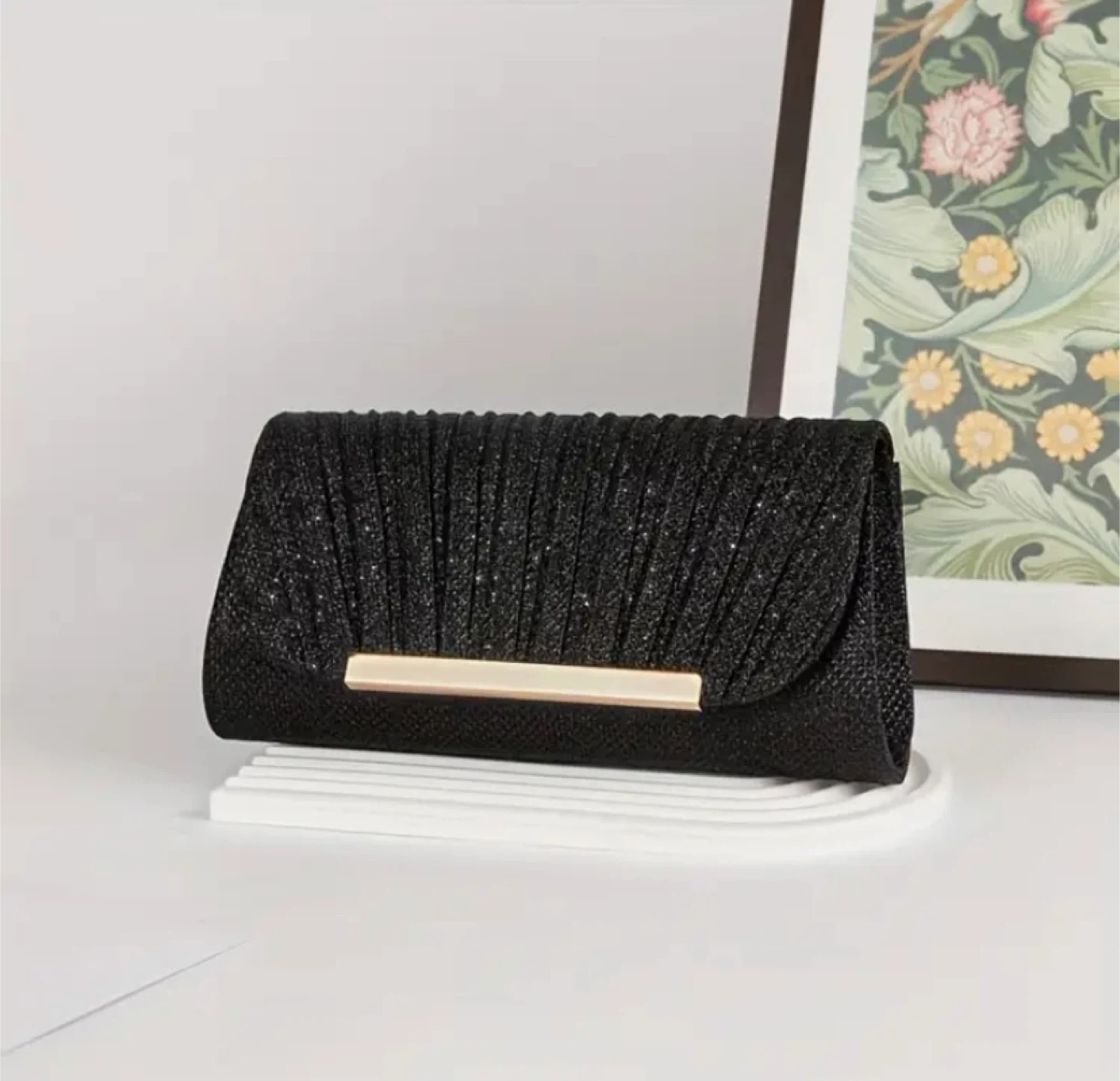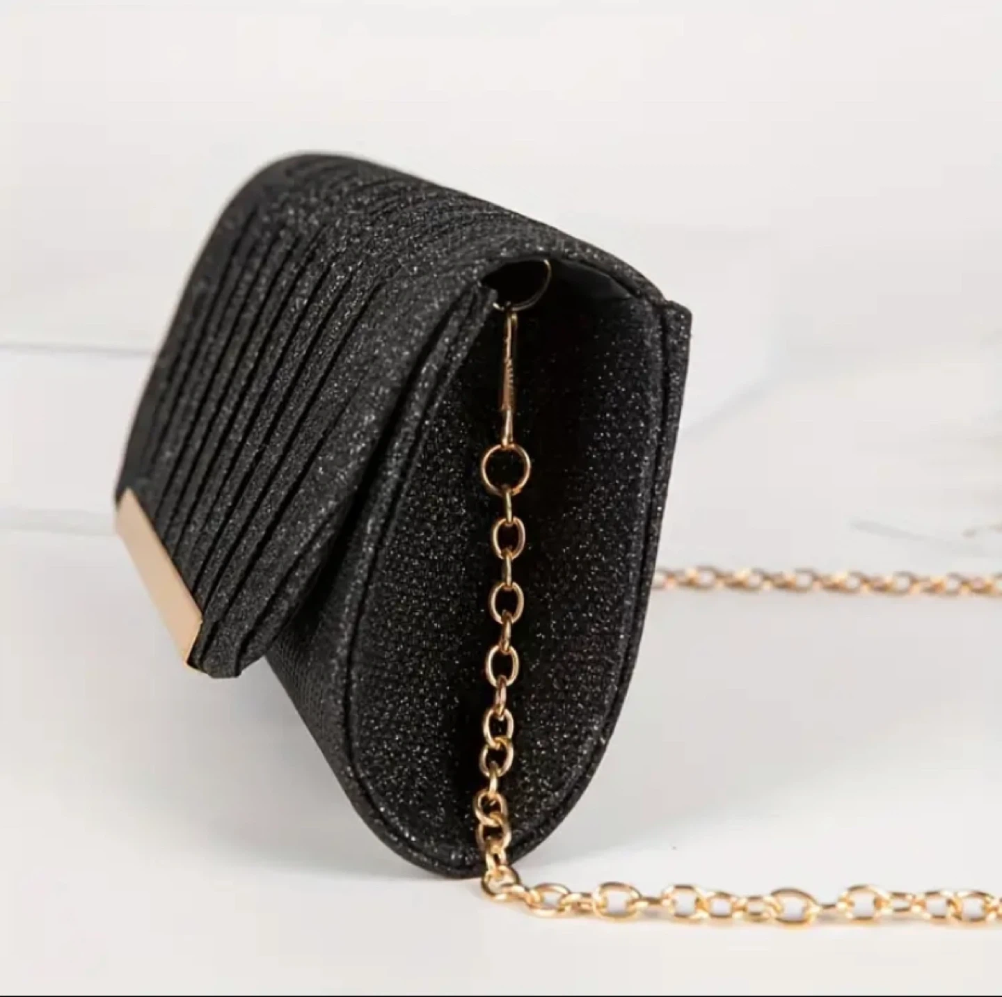 This is a lovely black evening clutch, perfect for a night out or special occasion. It has a sleek design with a gold-tone clasp and a delicate chain. The clutch is new and ready to add a touch of elegance to your outfit
