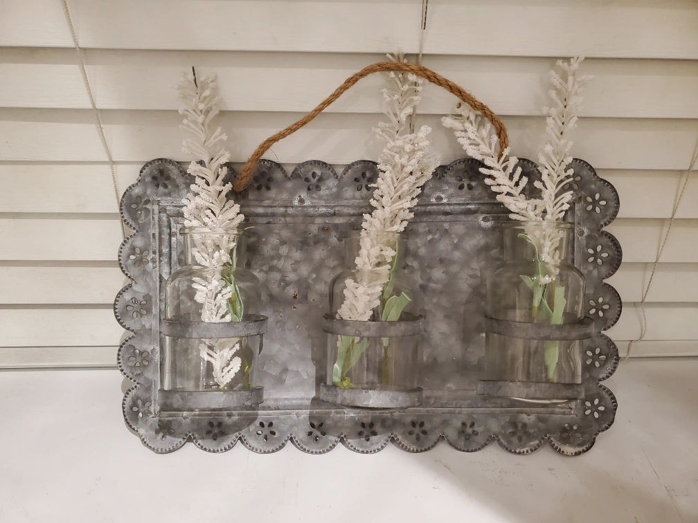 Add a touch of rustic charm to your home with this metal wall decor! It features a galvanized metal frame with decorative edges and three clear glass vases perfect for displaying flowers or greenery. The piece hangs easily with a sturdy rope hanger, making it a simple way to elevate any space