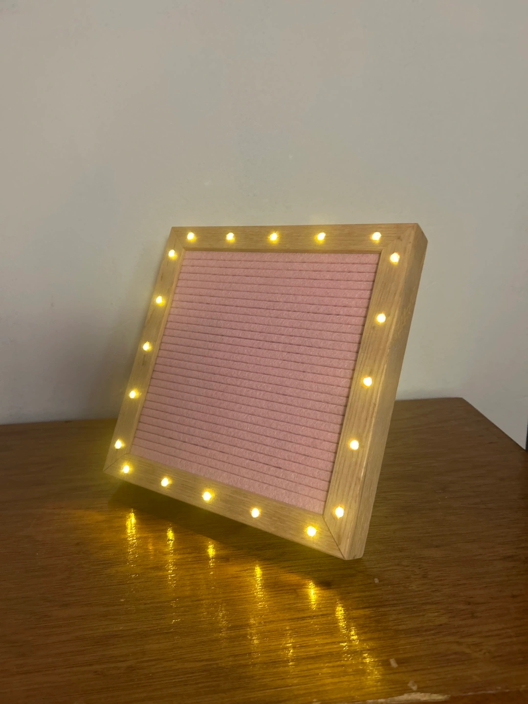 • Soft pink felt with horizontal grooves for easy letter placement. • Warm white LED lights around the wooden frame. • Freestanding design for desks, shelves, or countertops. • Compact and lightweight, size: 10”x10” • I’m adding some letters I have left. Perfect for quotes, messages, announcements, or decor. Great for home, office, parties, or small businesses. Batteries not included. Available for meet-up at TTC subway or pickup.