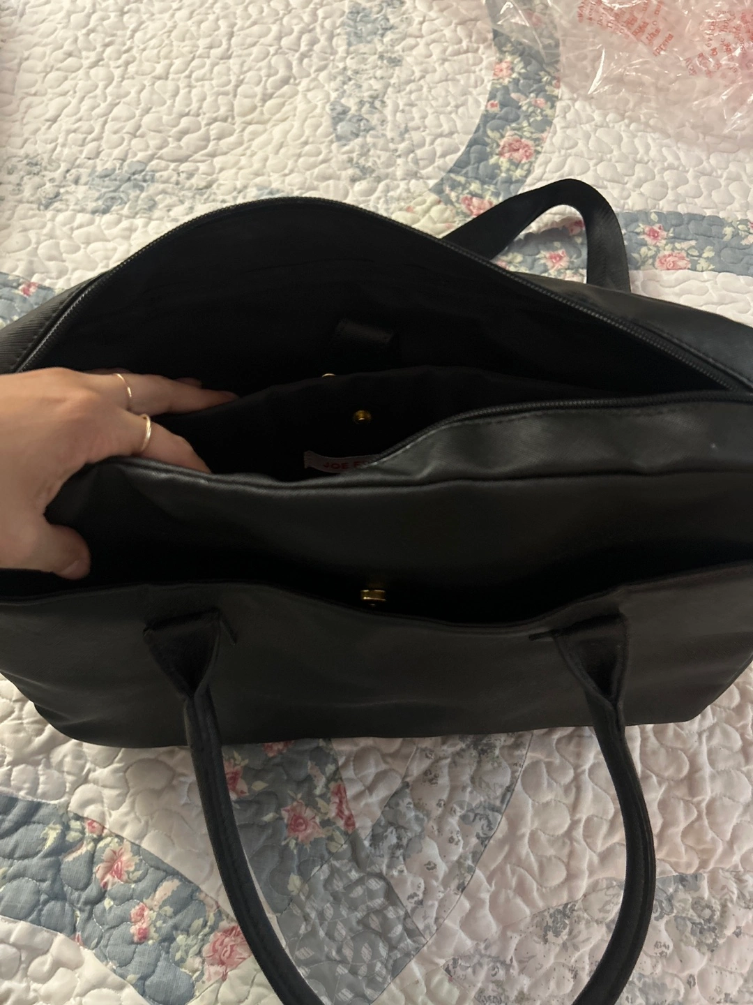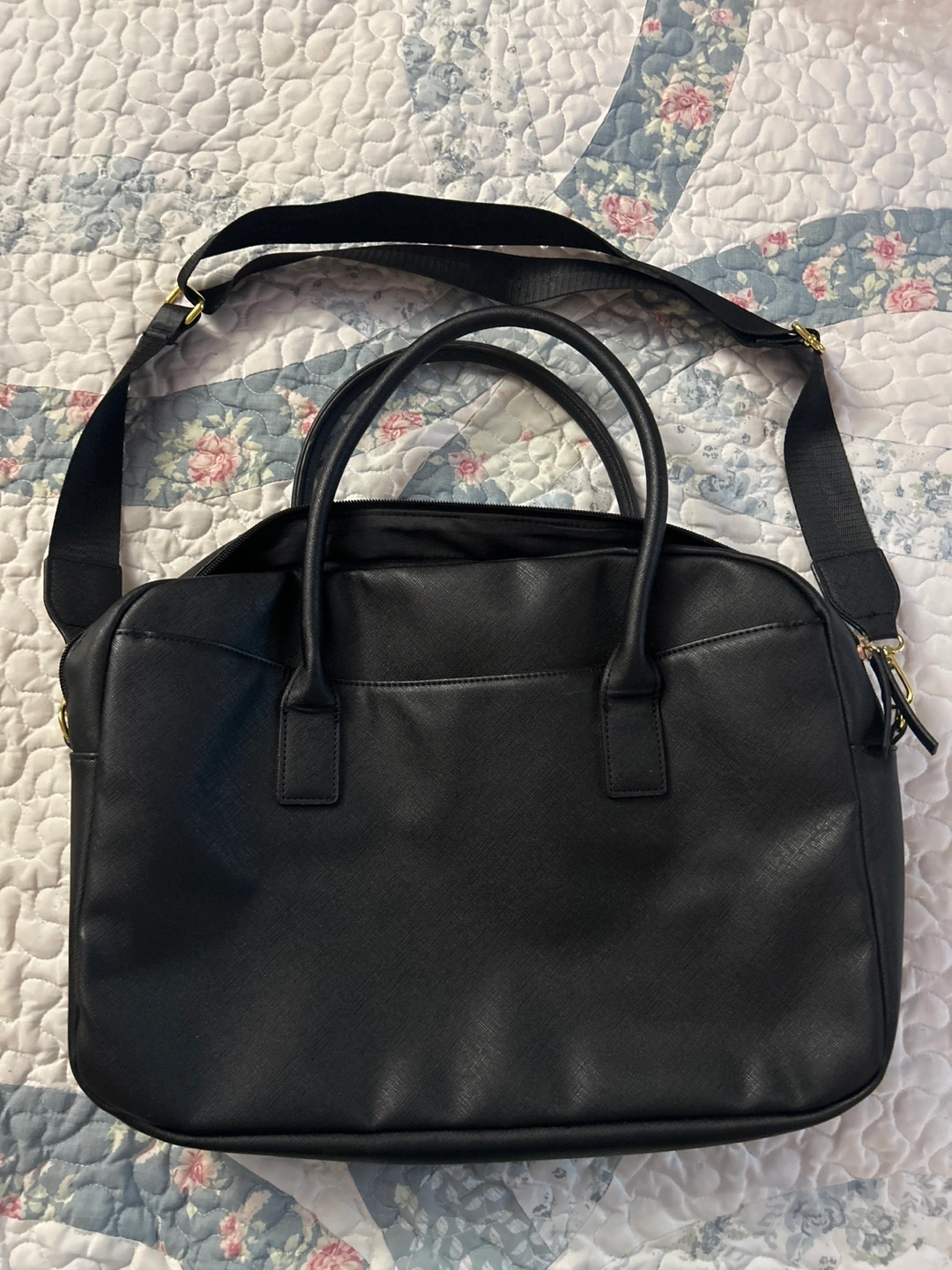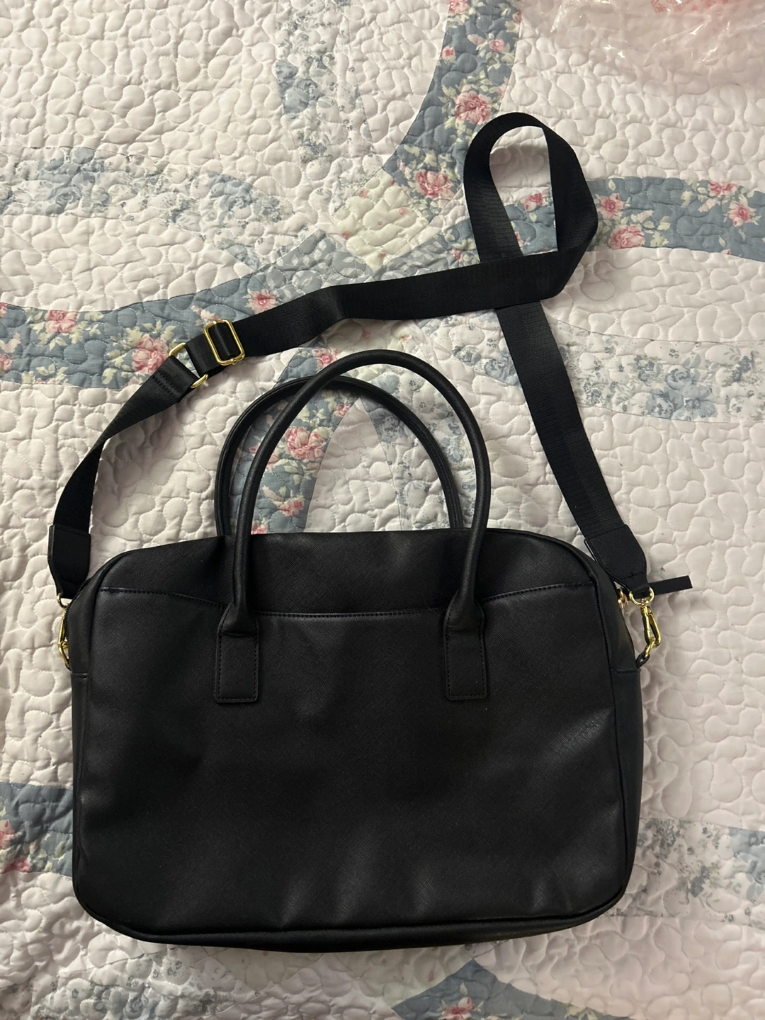 • Sleek faux-leather design with top handles and detachable adjustable strap. • Spacious interior with compartments for laptop, documents, or daily essentials Classic black with gold hardware – versatile for work, school, or travel. • Condition: Excellent, gently used (see photos) Available for meet-up at TTC subway or pickup.