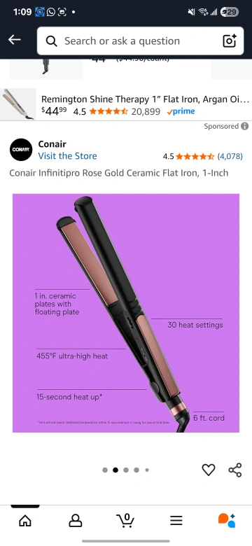 I'm selling a Conair InfinitiPro flat iron in rose gold! It has 1-inch ceramic plates with a floating plate. This flat iron heats up in just 15 seconds and reaches an ultra-high heat of 455°F. It also features 30 different heat settings