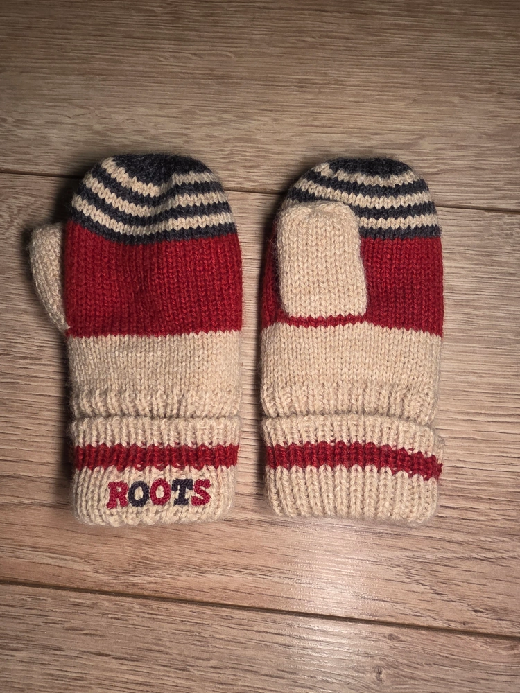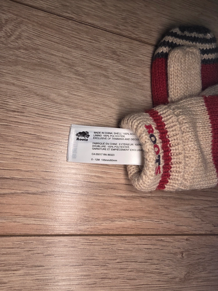 Keep your little one warm with these adorable Roots mittens! They are sized for 0-12 months (135mm/60mm). The shell is 100% acrylic and the lining is 100% polyester. Perfect for those chilly Canadian days Too big for my kid, so they have never been worn.
